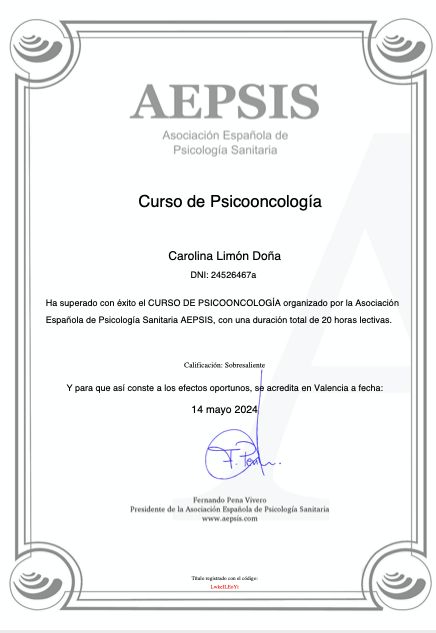 ¿Cuáles son las principales especialidades de Carolina Limón Doña?Carolina Limón Doña es psicóloga. Te mostramos algunos de los servicios que ofrece gracias a su trayectoria y amplia experiencia: Primera visita Psicología, Acompañamiento psicológico en el proceso personal, Consulta online, Psicología online, Primera visita Psicología Infantil, Terapia cognitivo-conductual, Visita Psicología, Atención psicológica, Diagnóstico y tratamiento para trastornos de ansiedad, Masaje terapéutico.