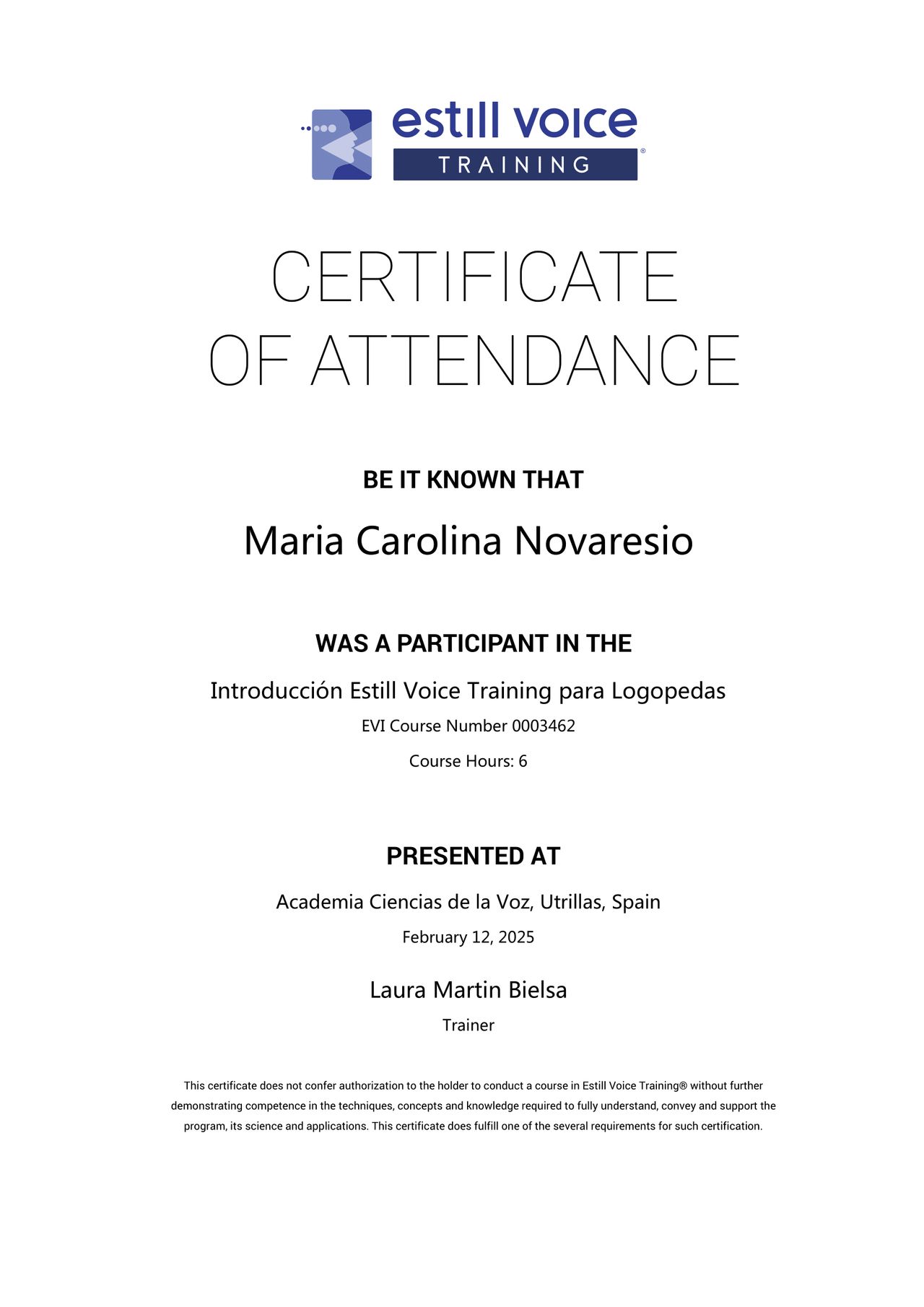 ¿Cuáles son las principales especialidades de Carolina Novaresio?Carolina Novaresio es logopeda. Te mostramos algunos de los servicios que ofrece gracias a su trayectoria y amplia experiencia: Visita Logopedia y Logofoniatría, Visita de revisión, Técnica vocal para profesionales de la voz, Primera visita Logopedia y Logofoniatría, Consulta sucesiva logopedia, Tratamiento para disfonía, Consulta online, Logopedia, Visita de tratamiento, Estrategias terapéuticas en comunicación y habilidades sociales.