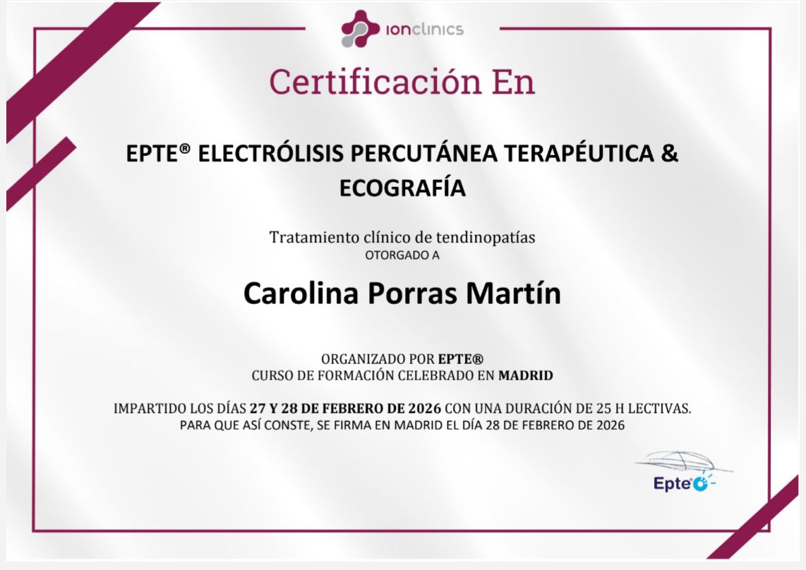 ¿Cuáles son las principales especialidades de Carolina Porras Martín?Carolina Porras Martín es fisioterapeuta. Te mostramos algunos de los servicios que ofrece gracias a su trayectoria y amplia experiencia: Tratamiento de fisioterapia, Fisioterapia, Consulta online, Ejercicios de tonificación de core, Electroestimulación muscular, Masaje deportivo, Reentrenamiento al esfuerzo, Rehabilitación del aparato locomotor, Rehabilitación gran invalidez, Tratamiento con neuromodulación percutánea.