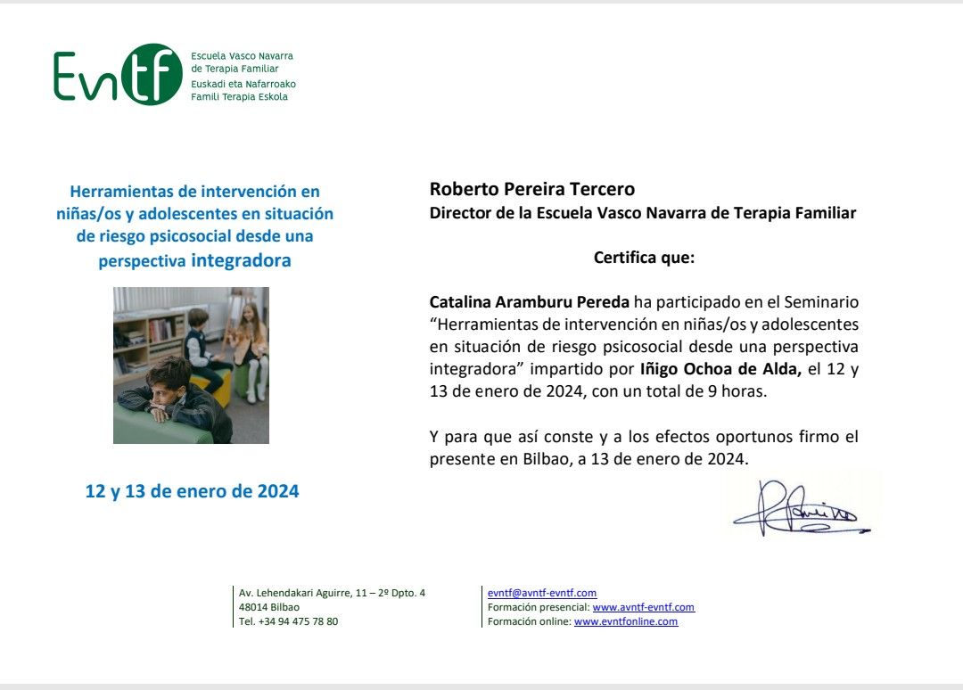 ¿Cuáles son las principales especialidades de Catalina Aramburu?Catalina Aramburu es psicóloga. Te mostramos algunos de los servicios que ofrece gracias a su trayectoria y amplia experiencia: Primera visita Psicología, Terapia familiar, Psicoterapia en adolescentes, Psicoterapia individual, Terapia de pareja, Terapia individual, Terapia de duelo, Gestión de la ansiedad, Gestión del estrés, Consulta online.