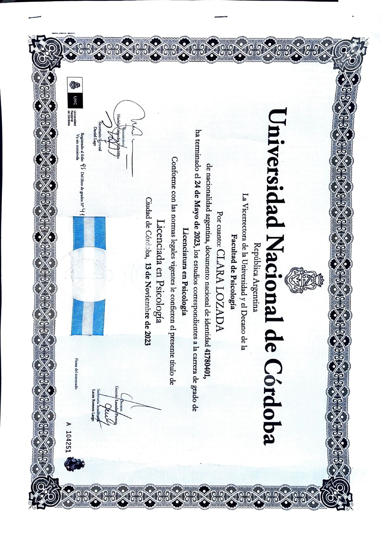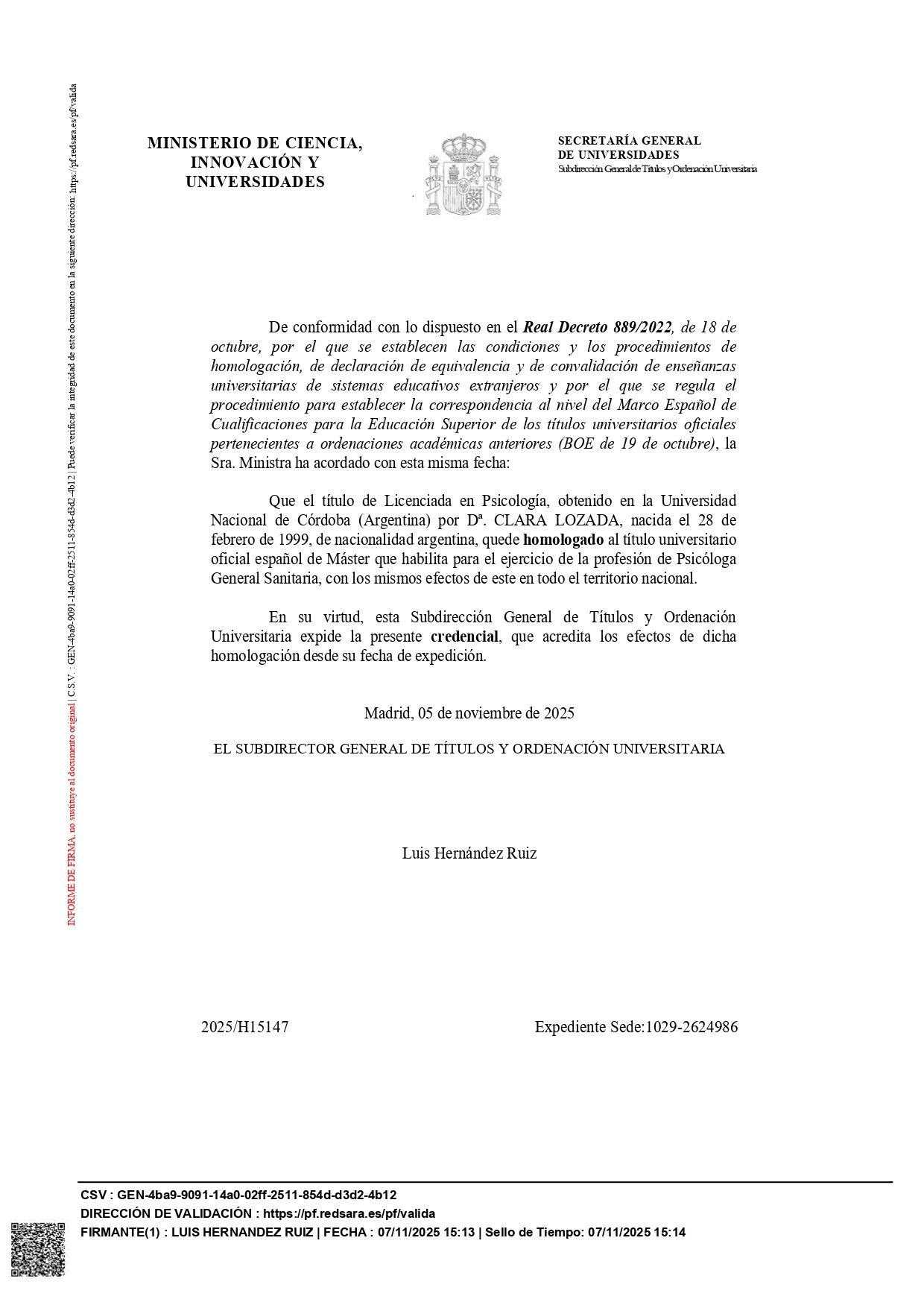 Soy Clara Lozada, psicóloga sanitaria argentina viviendo en Madrid hace más de un año. Estoy colegiada con el número Nº M-44375. Me especializo en ansiedad, terapia de pareja, autoconocimiento, regulación emocional y perinatalidad. Trabajo desde la terapia integrativa con bases en conductual contextual y mi objetivo es ofrecerte un espacio seguro, de respeto y empatía, totalmente flexible gracias a la consulta online.