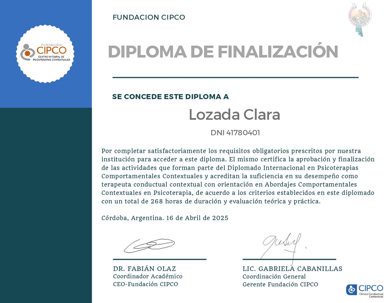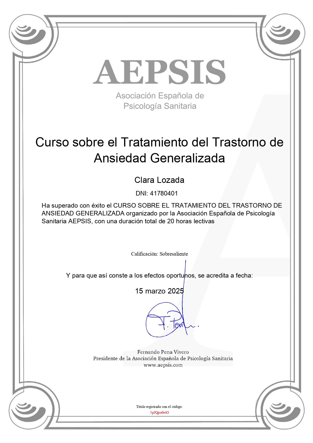 ¿Cuáles son las principales especialidades de Clara Lozada?Clara Lozada es psicóloga. Te mostramos algunos de los servicios que ofrece gracias a su trayectoria y amplia experiencia: Consulta online, Consulta online terapia individual, Psicoterapia online, Consulta psicológica online, Tratamiento en problemas de ansiedad y estrés (sesiones online), Modificación del estilo de vida (sesiones online), Tratamiento online de problemas de ansiedad, Terapia online, Tratamiento en autoestima (sesiones online).