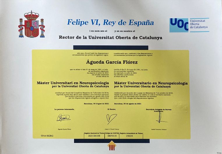 •Águeda García Flórez, Psicóloga Sanitaria y Neuropsicóloga especializada en trastorno mental grave (esquizofrenia, bipolar, personalidad), dependencias y enfermedades neurodegenerativas. Además, cuenta con formación en gestión emocional, autoestima y análisis de conducta.
