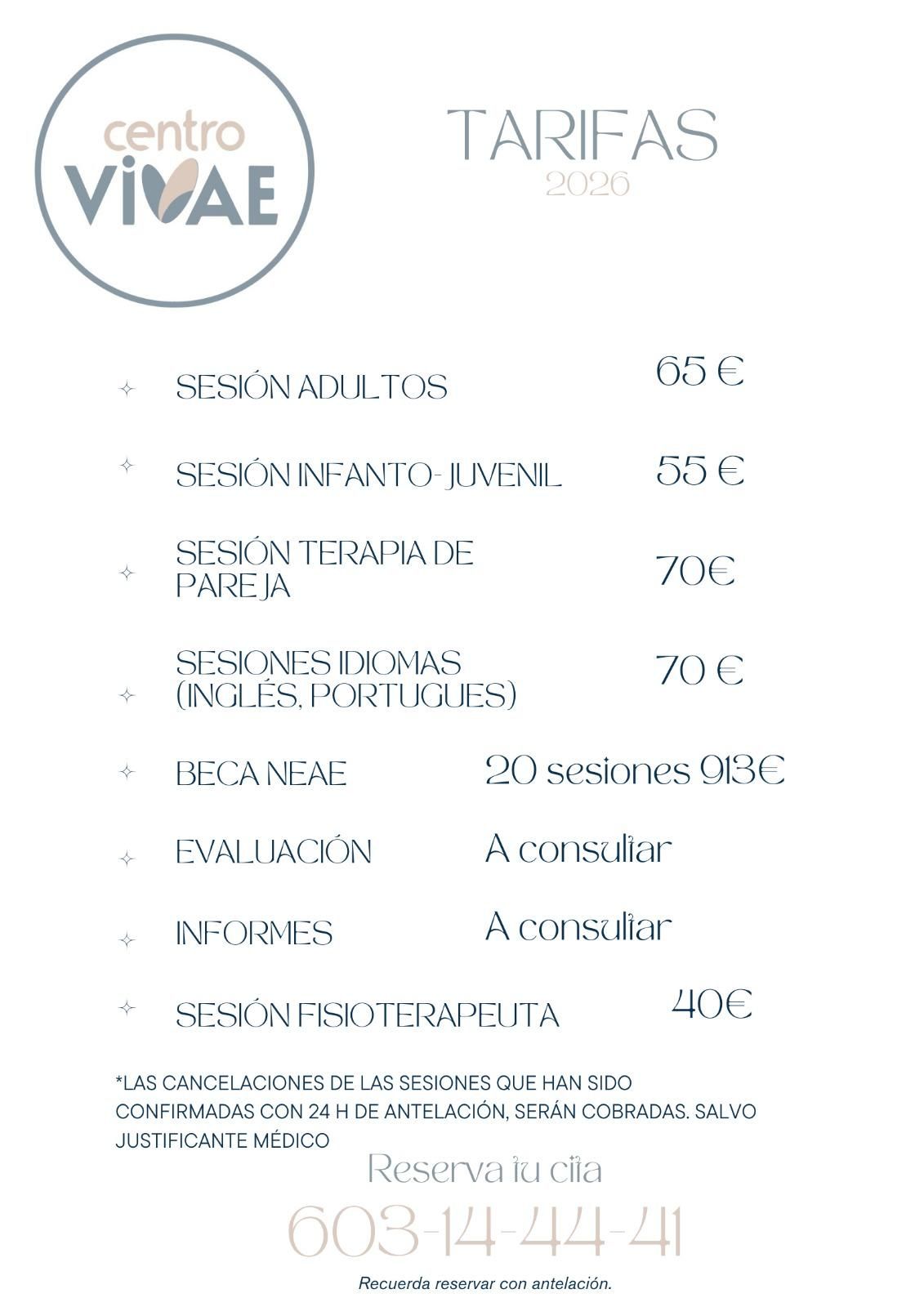 ¿Qué especialidades trata Centro Vivae en Fuengirola?Centro Vivae cuenta con un amplio equipo en Fuengirola que cubre las siguientes especialidades: Psicología, Psicología Infantil, Psicopedagogía, Sexología.