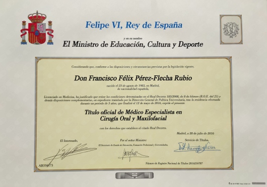 Se especializó en Cirugía Oral y Maxilofacial y Cabeza y Cuello en el Hospital Ramón y Cajal. Acreditado por la Sociedad Española de C. Oral y Maxilofacial (SECOM), acreditado BOARD por la Sociedad Europea de C. Oral y Maxilofacial (EACMFS). Master en Medicina Estética por la Universidad complutense de Madrid y Titulo de Experto en Cirugía Ortognática por la Universidad Alcalá de Henares.