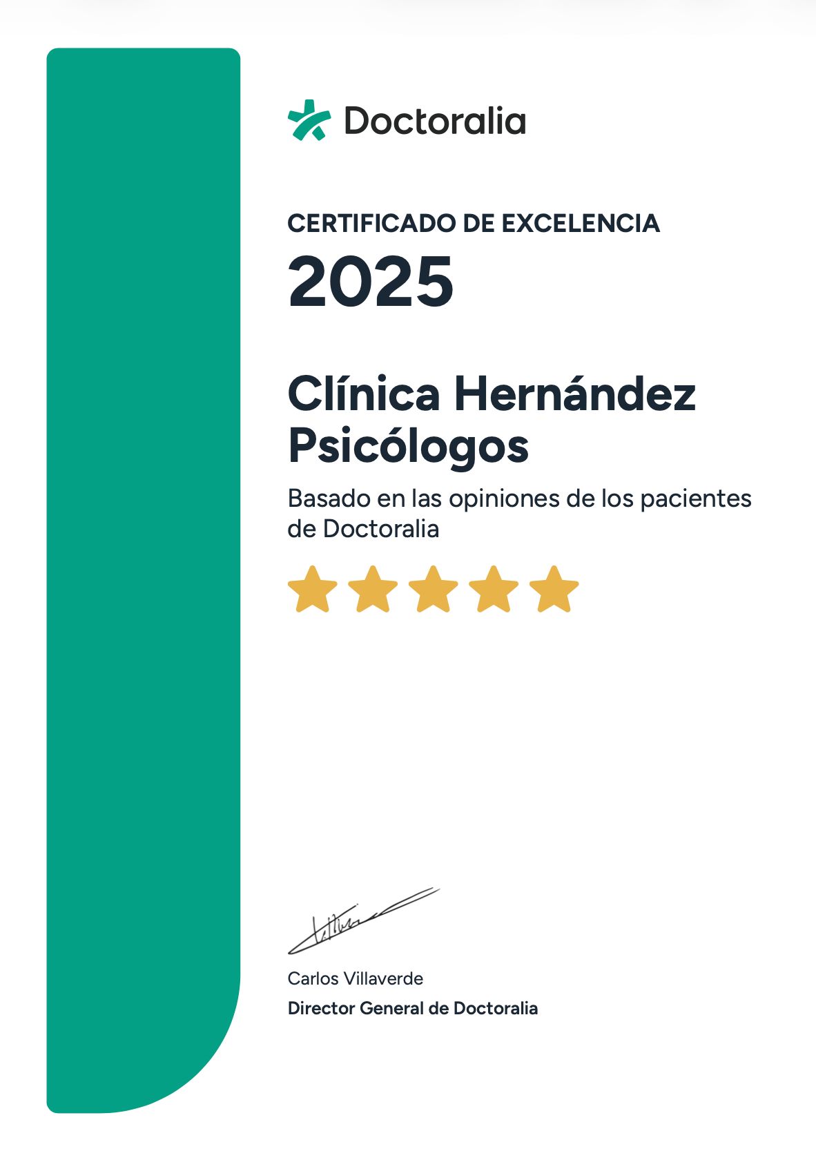Doctoralia nos ha otorgado el certificado de excelencia 2025, basado en la experiencia de nuestros pacientes durante dicho año.