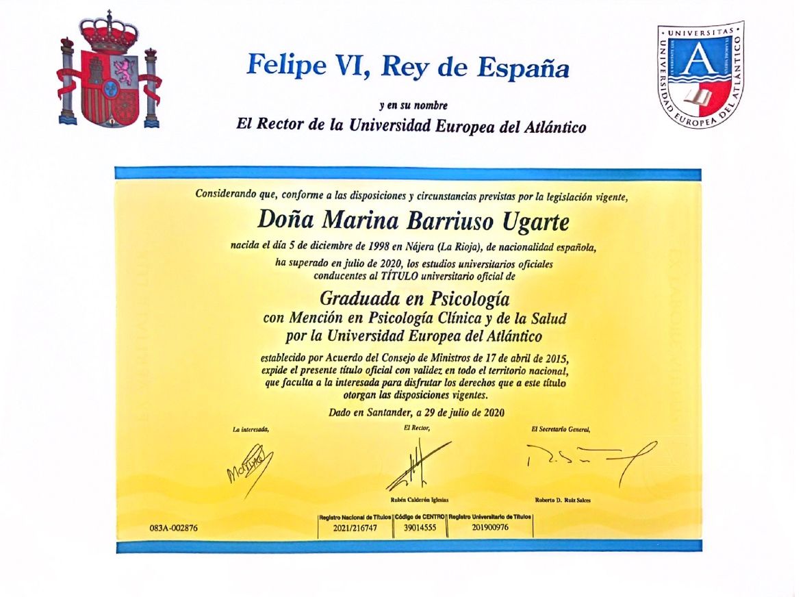 Soy Marina Barriuso Ugarte, Psicóloga General Sanitaria. Durante toda mi niñez y adolescencia he sentido un gran interés por ayudar y comprender a los demás. Es por ello, que decidí comenzar mi camino para formarme como Psicóloga. Mi formación comenzó en la facultad de Psicología de la Universidad Europea del Atlántico en Santander, donde tuve mi primera toma de contacto con la práctica clínica en el ámbito Infanto- juvenil, en concreto en la intervención de personas diagnosticadas con Trastorno del Espectro Autista.