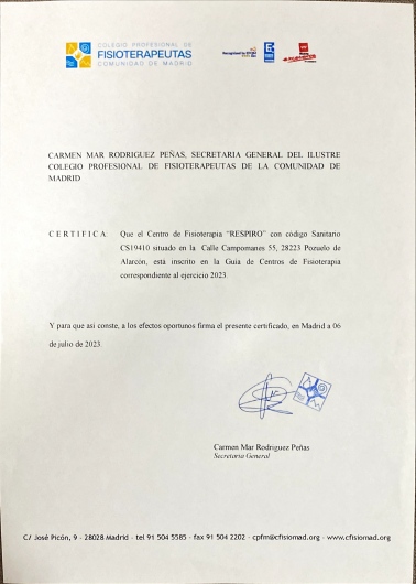 ¿Qué especialidades trata Respiro Atención Integral Respiratoria en Pozuelo de Alarcón?Respiro Atención Integral Respiratoria cuenta con un amplio equipo en Pozuelo de Alarcón que cubre las siguientes especialidades: Fisioterapia.