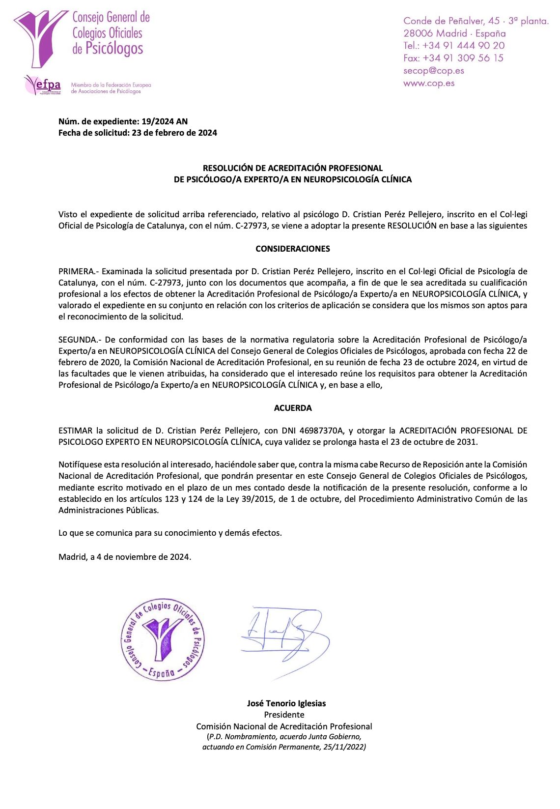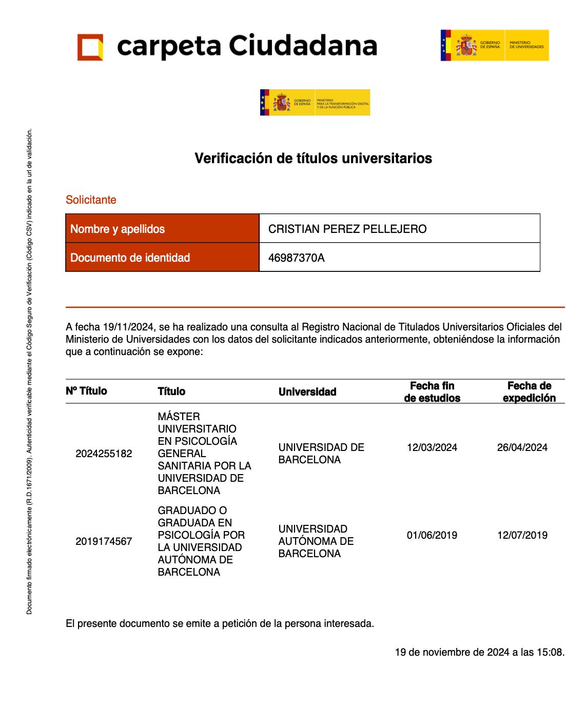 ¿Cuáles son las principales especialidades de Cristian Perez Pellejero?Cristian Perez Pellejero es psicólogo. Te mostramos algunos de los servicios que ofrece gracias a su trayectoria y amplia experiencia: Psicoterapia individual, Evaluación Infanto Juvenil, Consulta de evaluación neuropsicológica, Psicoterapia Infanto-juvenil, Consulta psicoterapéutica de adolescentes, Primera visita terapia, Psicoterapia, Terapia individual, Psicología infanto- juvenil, Valoración neuropsicológica.