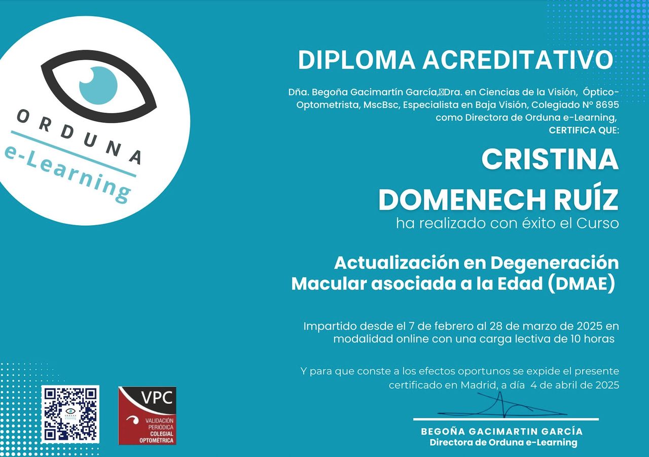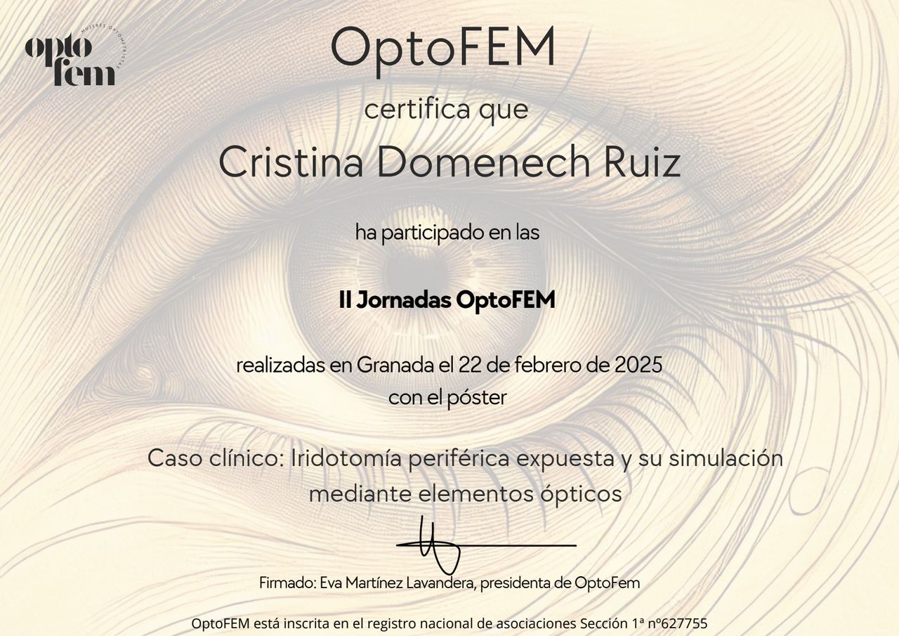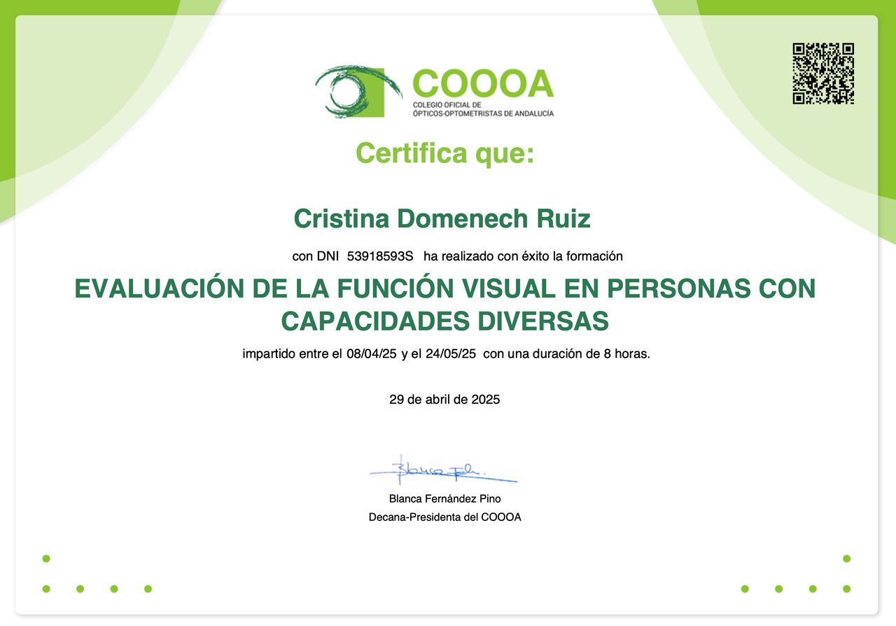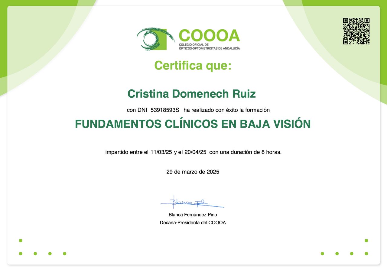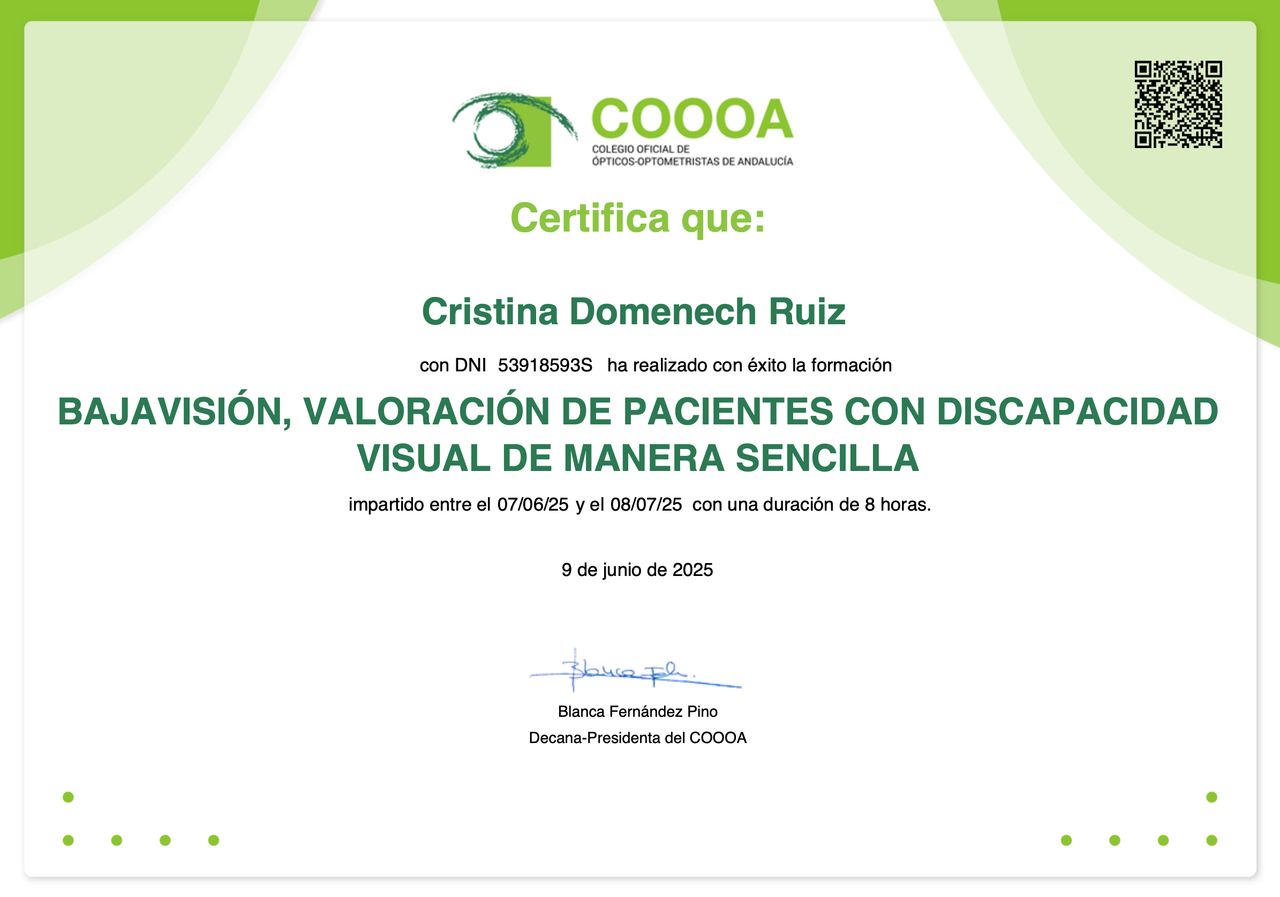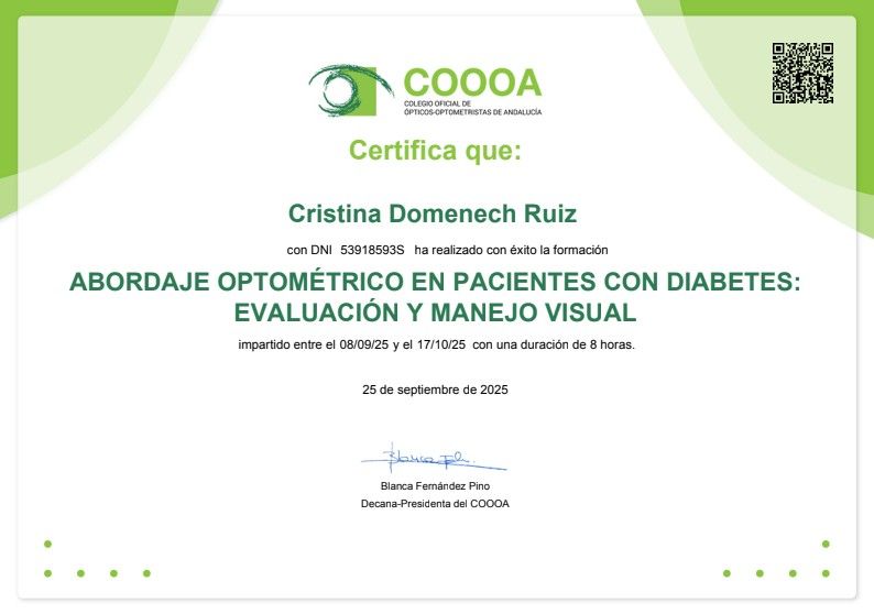 Graduada en Óptica y Optometría por la Universidad de Granada. Soy una persona con una gran pasión por el aprendizaje y una gran ética de trabajo. Siempre me esfuerzo por lograr mis objetivos y me apasionan los retos que me hagan crecer como profesional.