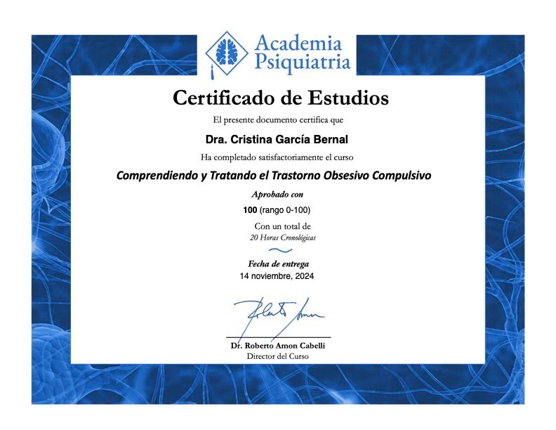 º Curso de Medicina del Sueño. Universidad Francisco de Vitoria. 8 ECTS. (2021.) º Curso de Psicopatología. Universidad Francisco de Vitoria. 6 ECTS. (2021.)