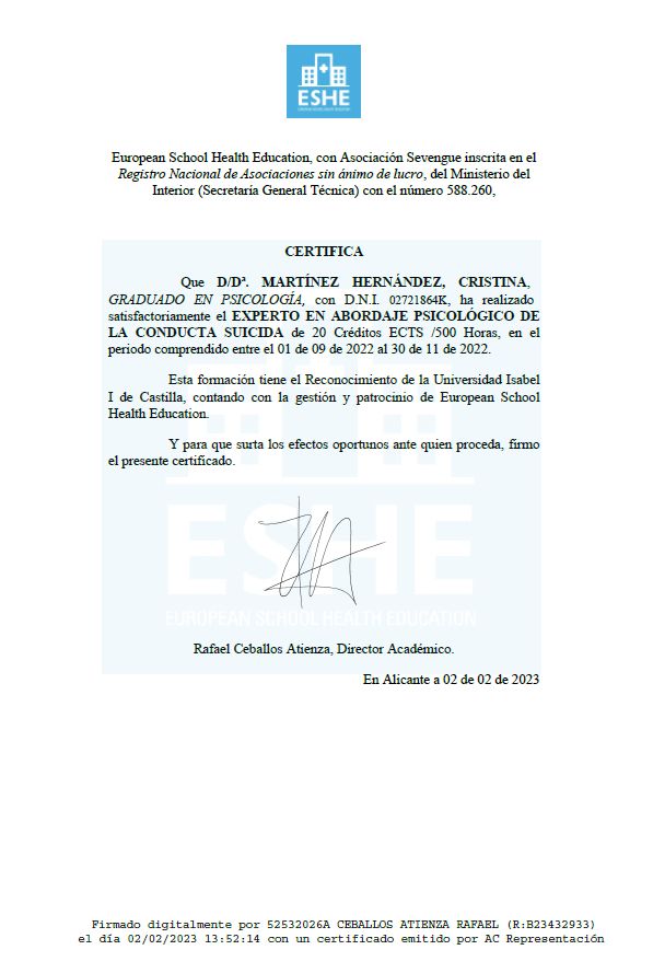 ¿Cuáles son las principales especialidades de Cristina Martínez Hernández?Cristina Martínez Hernández es psicóloga. Te mostramos algunos de los servicios que ofrece gracias a su trayectoria y amplia experiencia: Primera visita Psicología, Terapia de pareja, Terapia individual, Estimulación cognitiva, Primera cita gratuita, Tratamiento en autoestima, Terapia para la depresión, Terapia de duelo, Consulta sucesiva Terapia de Pareja, Comunicación asertiva.