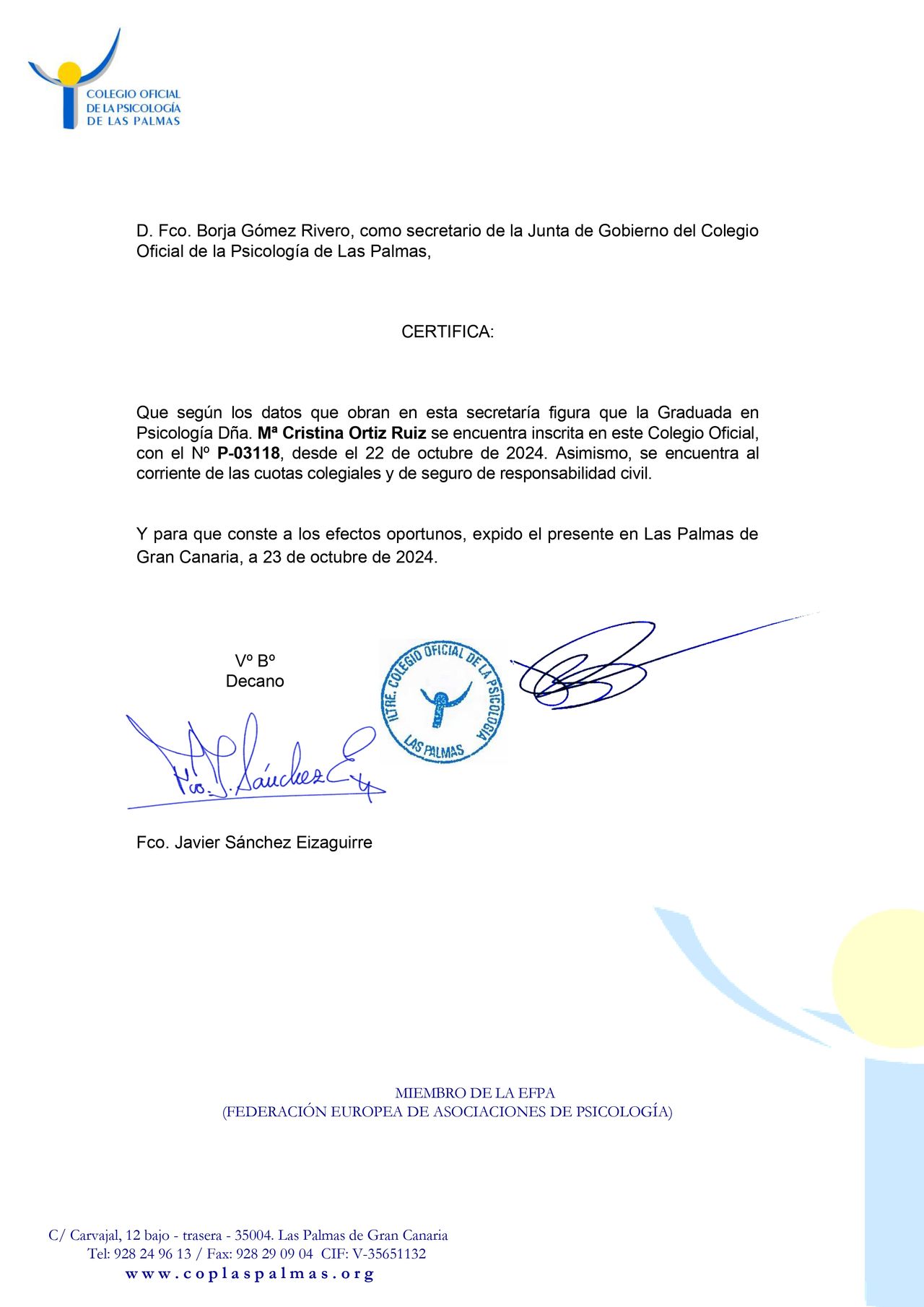 ¿Cuáles son las principales especialidades de Cristina Ortiz Ruiz?Cristina Ortiz Ruiz es psicóloga, psicóloga infantil. Te mostramos algunos de los servicios que ofrece gracias a su trayectoria y amplia experiencia: Consulta online, Primera visita Psicología, Psicoterapia Infanto-juvenil, Asesoramiento a padres y familias, Orientación familiar, Primera visita Psicología Infantil, Consulta de Psicología Sanitaria, Tratamiento para la ansiedad infantil, Visita Psicología infanto-juvenil, Visita sucesiva psicología.
