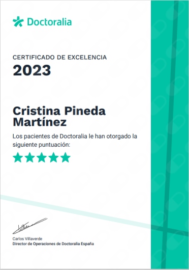 ¿Puedo hacer la visita con Cristina Pineda Martínez de forma online, sin tener que desplazarme hasta su consulta?Sí, Cristina Pineda Martínez ofrece consulta de forma remota. Solo tienes que seleccionar "consulta online" cuando vayas a reservar cita desde el calendario, y así podrás ver las fechas y horas disponibles.
