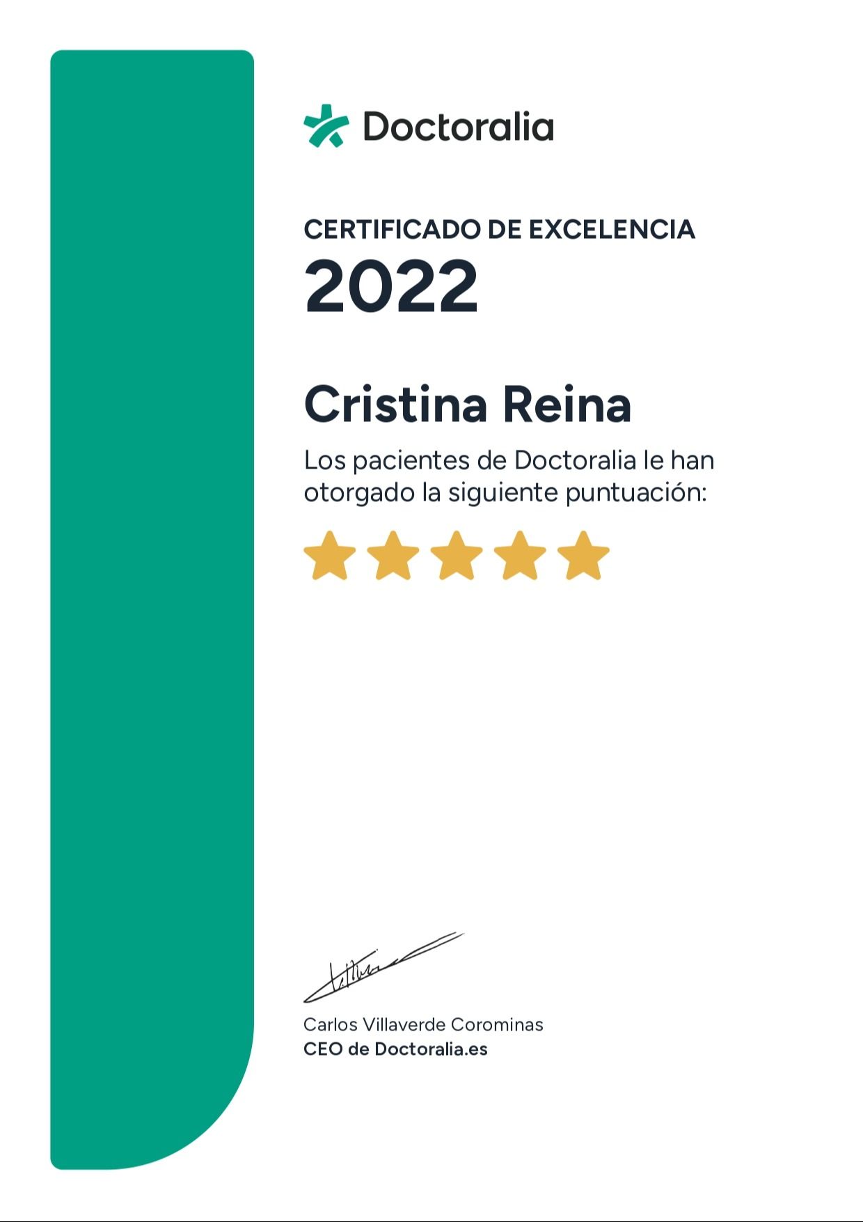 ¿Qué opinan los pacientes de Cristina Reina?Un total de 37 pacientes han querido dejar una opinión sincera y real sobre Cristina Reina, otorgándole además una valoración media de 5 estrellas (sobre un máximo de 5).