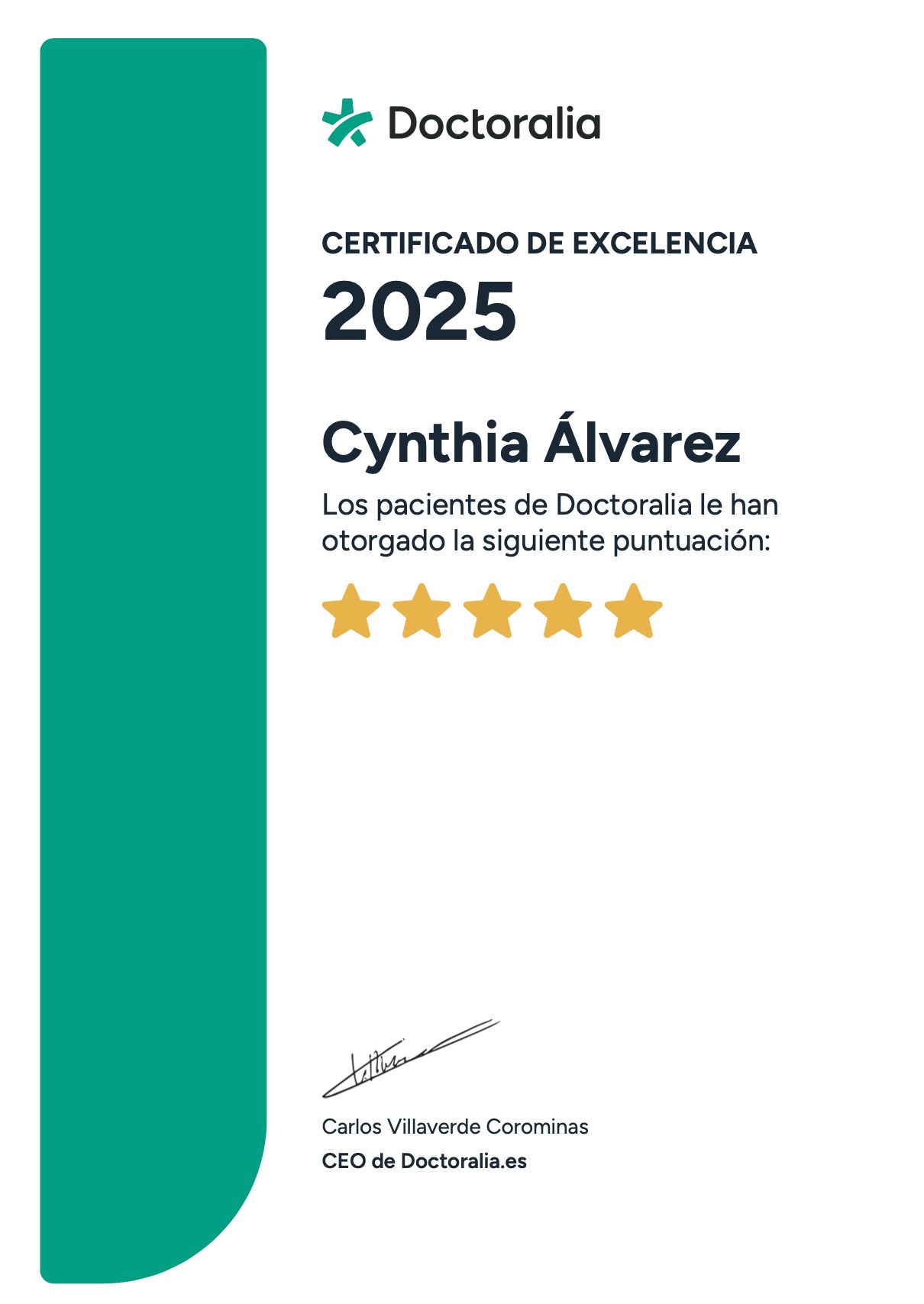 ¿Cómo puedo reservar una cita con Cynthia Álvarez?El calendario que muestra Cynthia Álvarez en Doctoralia está actualizado en tiempo real, por lo que solo tienes que elegir qué día y hora te va mejor de entre las disponibles. La reserva es gratuita, y además recibes un recordatorio antes de la visita.