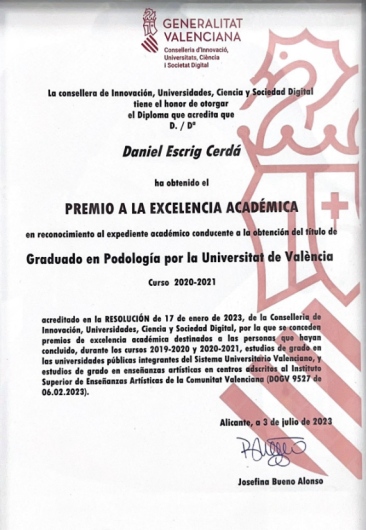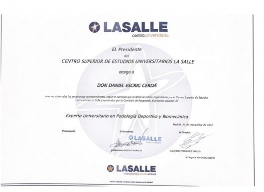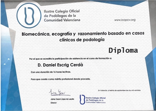 ¿Cuáles son las principales especialidades de Daniel Escrig Cerdà?Daniel Escrig Cerdà es podólogo. Te mostramos algunos de los servicios que ofrece gracias a su trayectoria y amplia experiencia: Primera visita Podología, Quiropodia, Estudio de la pisada, Visitas sucesivas Podología, Análisis de la marcha, Análisis de la técnica de carrera, Baropodometría electrónica, Cirugía de uña encarnada, Cirugía ecoguiada de tobillo y pie, Estudio de la pisada (estudio biomecánico).