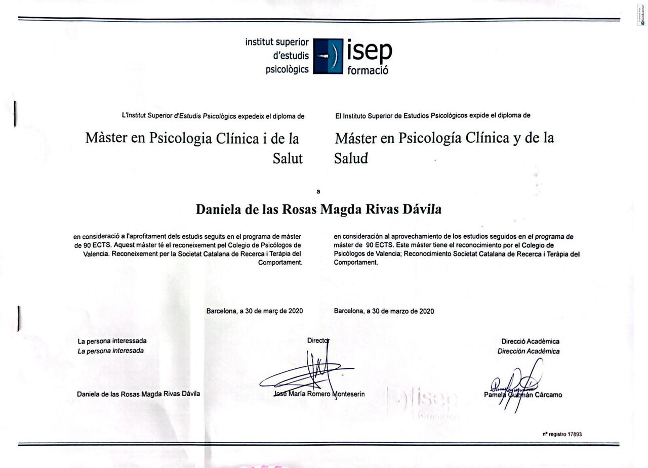 Soy Psicóloga Clínica, graduada en la Universidad Metropolitana (Caracas, Venezuela). Cuento con un diplomado en Terapia de Pareja y un máster en Psicología Clínica y de la Salud y Terapia Cognitivo-Conductual por el ISEP (Instituto Superior de Estudios Psicológicos, Madrid).