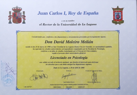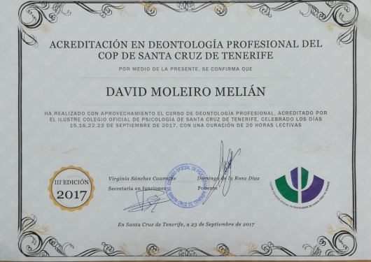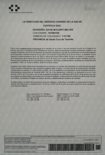 Estoy colegiado en el Illustre Colegio Oficial de Psicología de Santa Cruz de Tenerife con el nº T-1799 y formado como terapeuta EMDR a través de la Asociación EMDR España . Nuestro Centro de Psicología cuenta con el nº de registro 7.055 en el Servicio Canario de Salud.