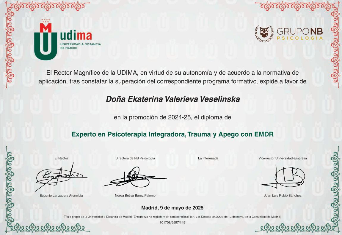 ¿Cuáles son las principales especialidades de Ekaterina Valerieva?Ekaterina Valerieva es psicóloga. Te mostramos algunos de los servicios que ofrece gracias a su trayectoria y amplia experiencia: Consulta online, Sesión psicología presencial, Terapia con EMDR, Primera visita (información), Primera visita Psicología, Visita sucesiva psicología, Terapia de pareja, Terapia familiar, Psicoterapia EMDR, Psicoterapia en adolescentes.