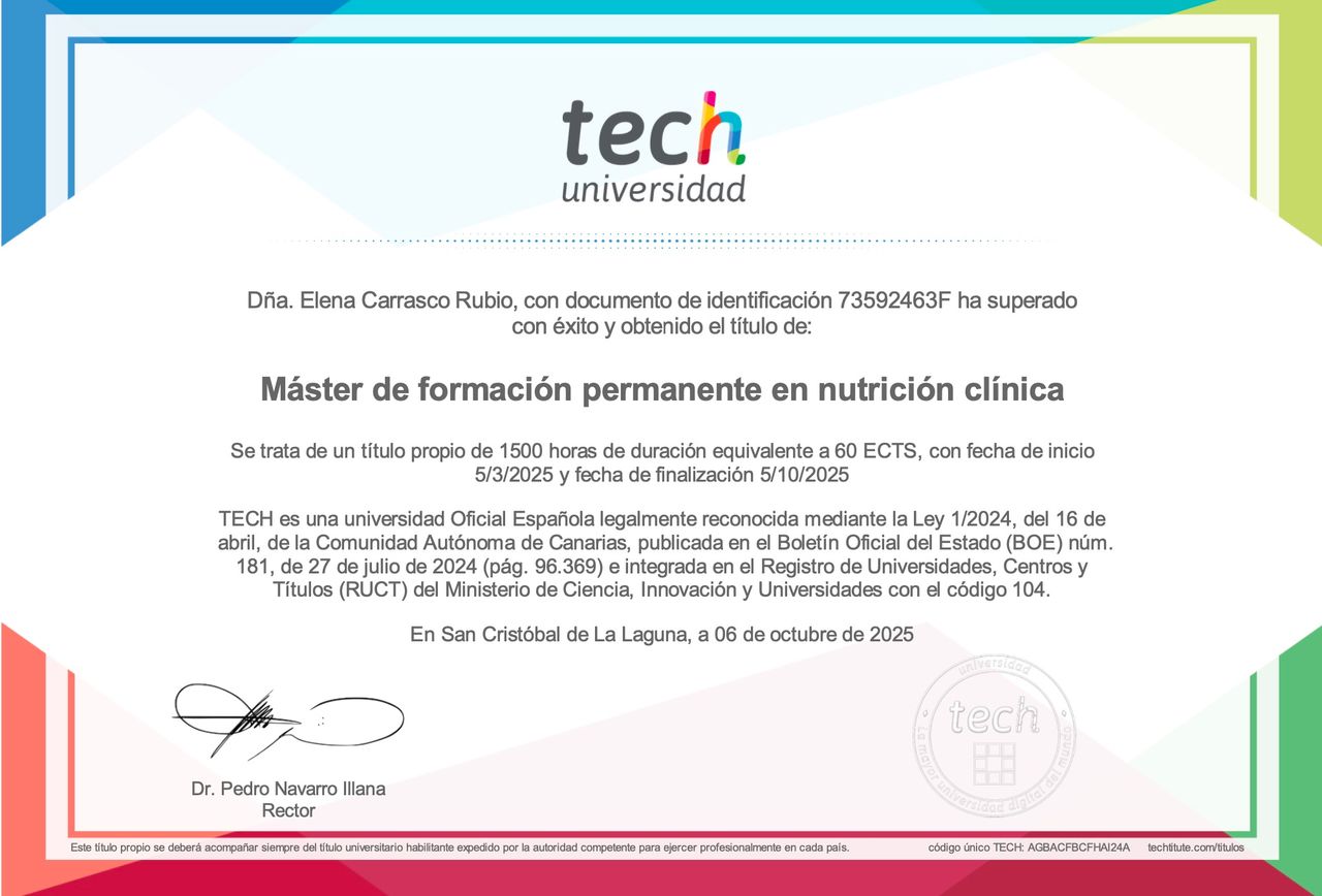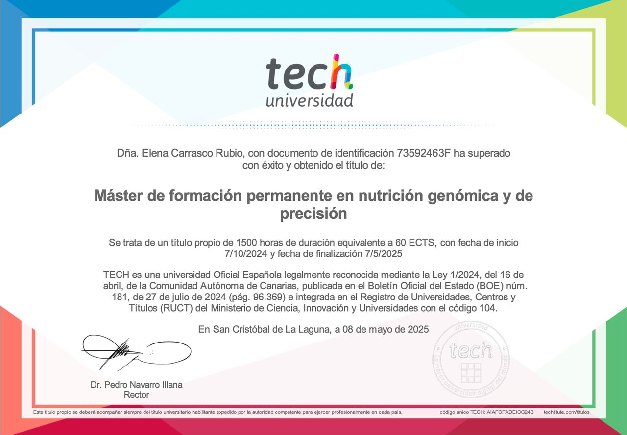 Soy graduada en Nutrición Humana y Dietética por la Universidad de Valencia. Además, cuento con un Máster en Nutrición Genética y de Precisión y un Máster en Nutrición Clínica por la Universidad Tecnológica de México. También tengo formación universitaria en liderazgo y estudios orientados a la prevención de la transmisión de enfermedades genéticas, avalados por la Sociedad Valenciana de Medicina Familiar y Comunitaria.