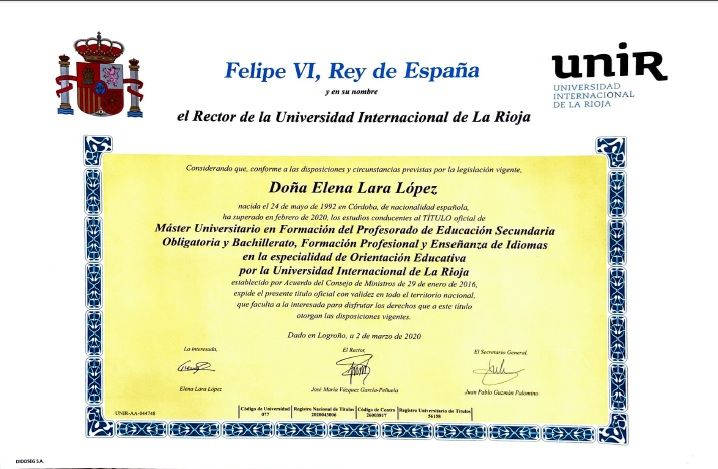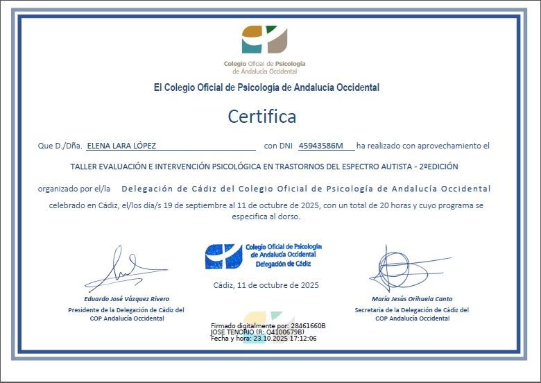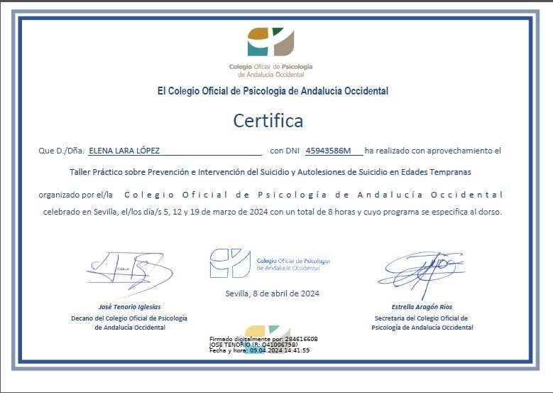 Soy Elena Lara López, Psicóloga General Sanitaria (col. AN11915), graduada por la Universidad de Granada y con Máster en Psicología General Sanitaria por la Universidad Loyola. También cuento con formación en neurodesarrollo, inteligencia emocional, orientación educativa y perspectiva de género.