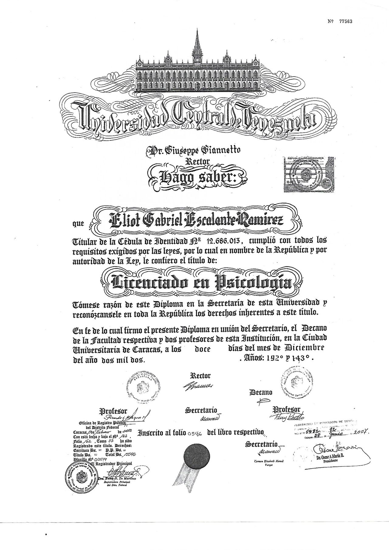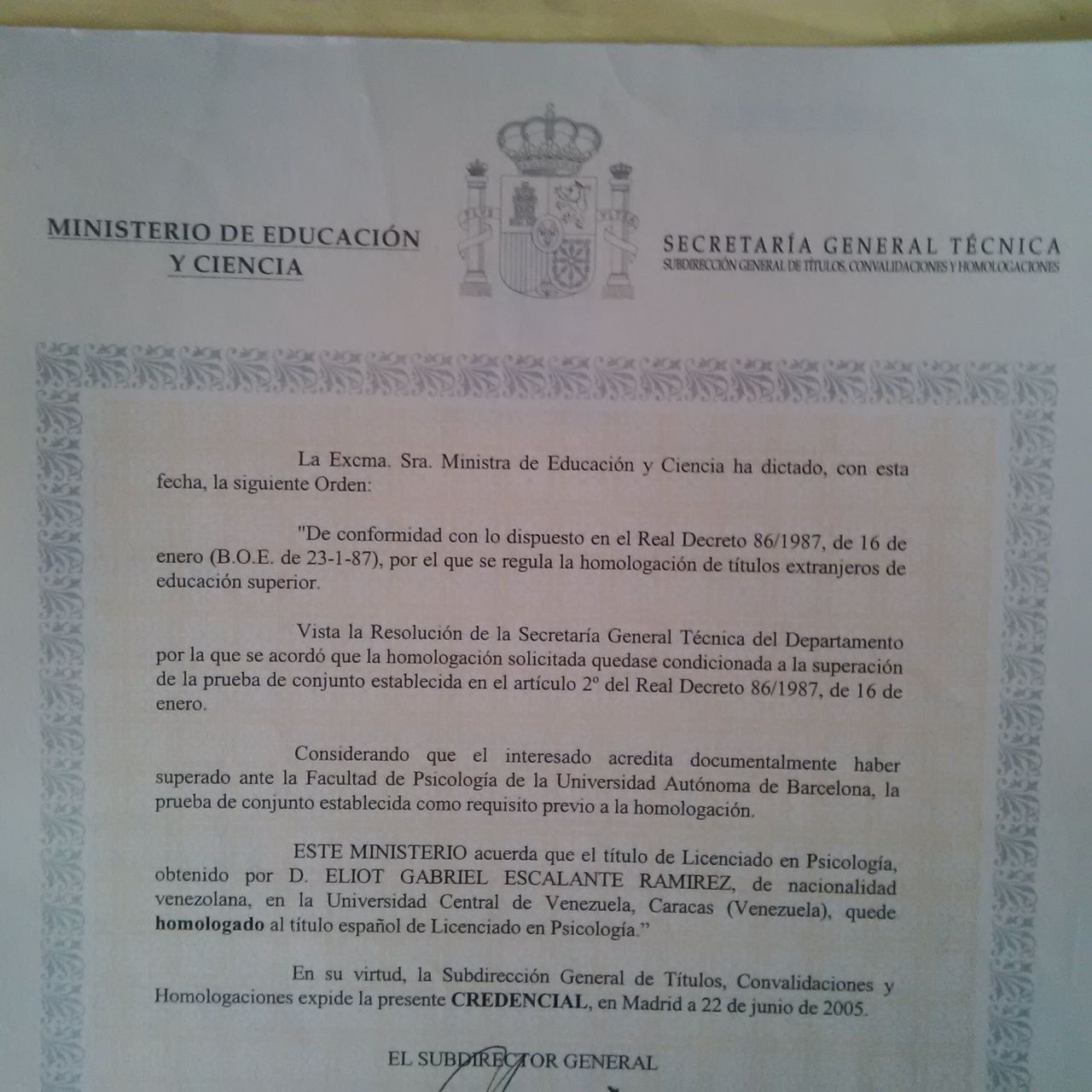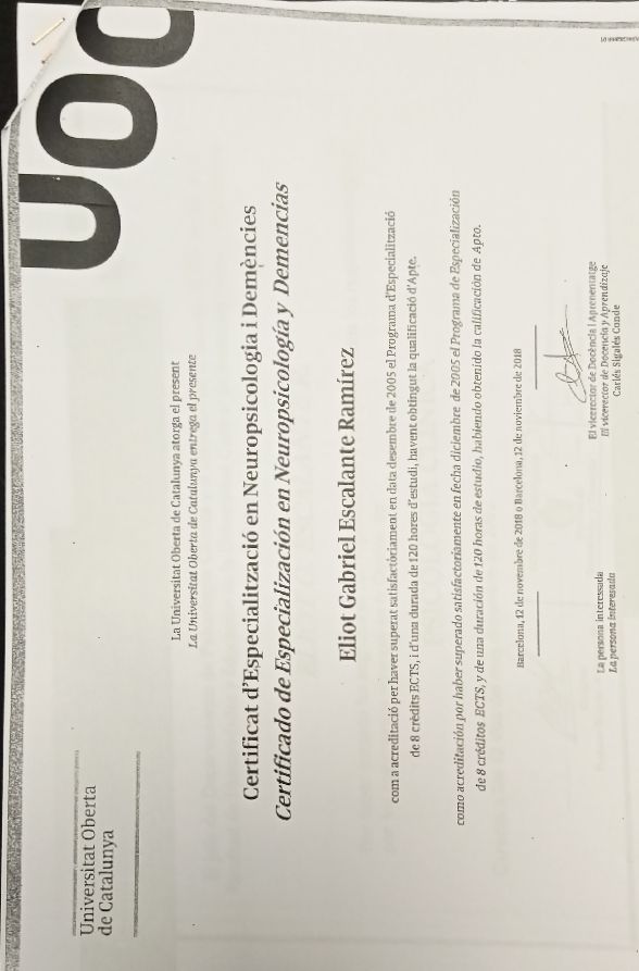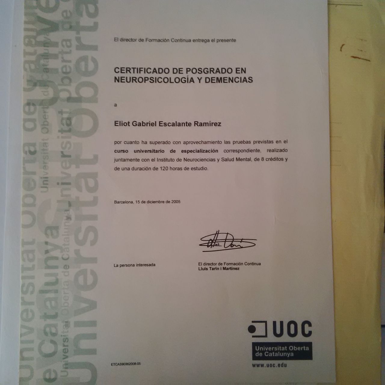 ¿Cuáles son las principales especialidades de Eliot Gabriel Escalante Ramirez?Eliot Gabriel Escalante Ramirez es psicólogo. Te mostramos algunos de los servicios que ofrece gracias a su trayectoria y amplia experiencia: Primera visita Psicología, Estimulación cognitiva a personas con Alzheimer, Estimulación cognitiva a domicilio, Apoyo psicológico a cuidadores de personas dependientes, Intervención psicológica para inmigrantes, Psicoterapia de intervención en crisis y urgencias, Psicoterapia familiar, Acompañamiento en el proceso de duelo, Apoyo psicológico a estudiantes de oposición, Entrenamiento en habilidades sociales.