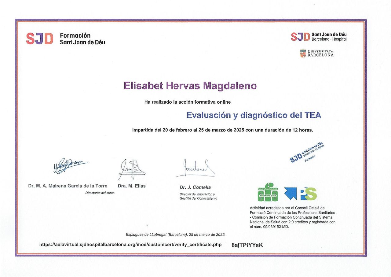 ¿Cuáles son las principales especialidades de Elisabet Hervás Magdaleno?Elisabet Hervás Magdaleno es psicóloga. Te mostramos algunos de los servicios que ofrece gracias a su trayectoria y amplia experiencia: Terapia individual, Visitas sucesivas Psicología, Visita de tratamiento, Reestructuración cognitiva, Primera visita Psicología Infantil, Consulta de Psicología Sanitaria, Desensibilización sistemática, Visita Psicología, Terapia cognitivo-conductual, Diagnóstico y tratamiento para trastornos de ansiedad.