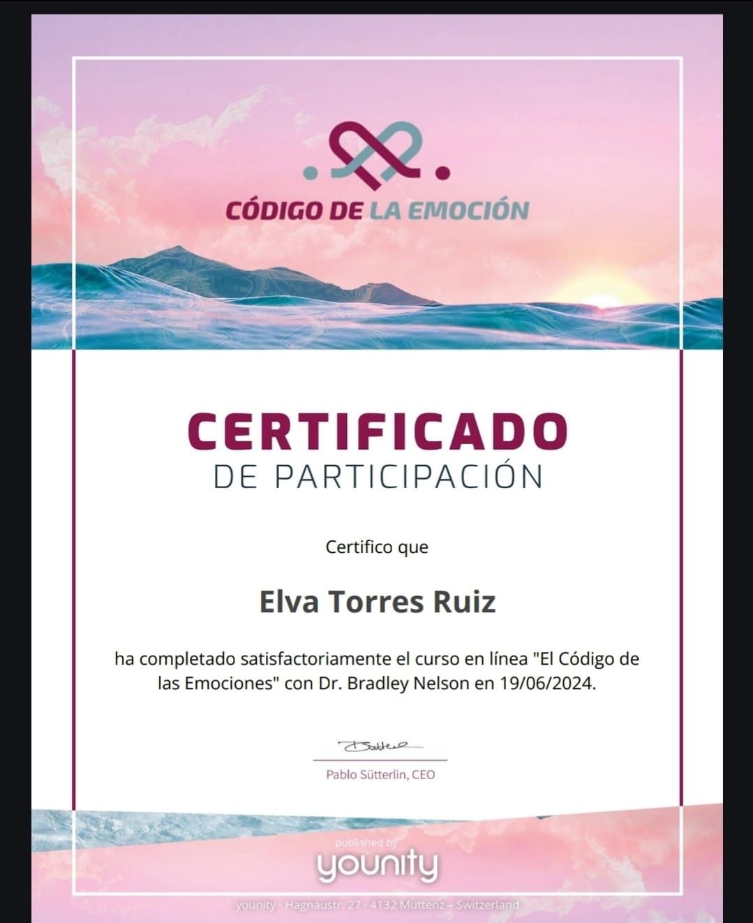 ¿Cuáles son las principales especialidades de Elva Torres Ruiz?Elva Torres Ruiz es terapeuta complementaria. Te mostramos algunos de los servicios que ofrece gracias a su trayectoria y amplia experiencia: Consulta online, Videoconsulta online, Primera visita online, Terapia online, Terapias Energéticas a Distancia, Seguimiento online, Visita Medicina Complementaria y terapias alternativas, Modificación del estilo de vida, Coaching personal, Terapia individual.