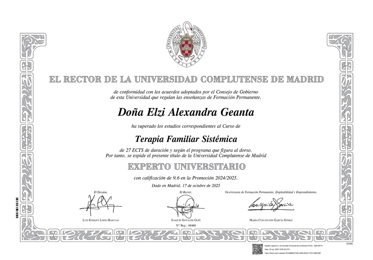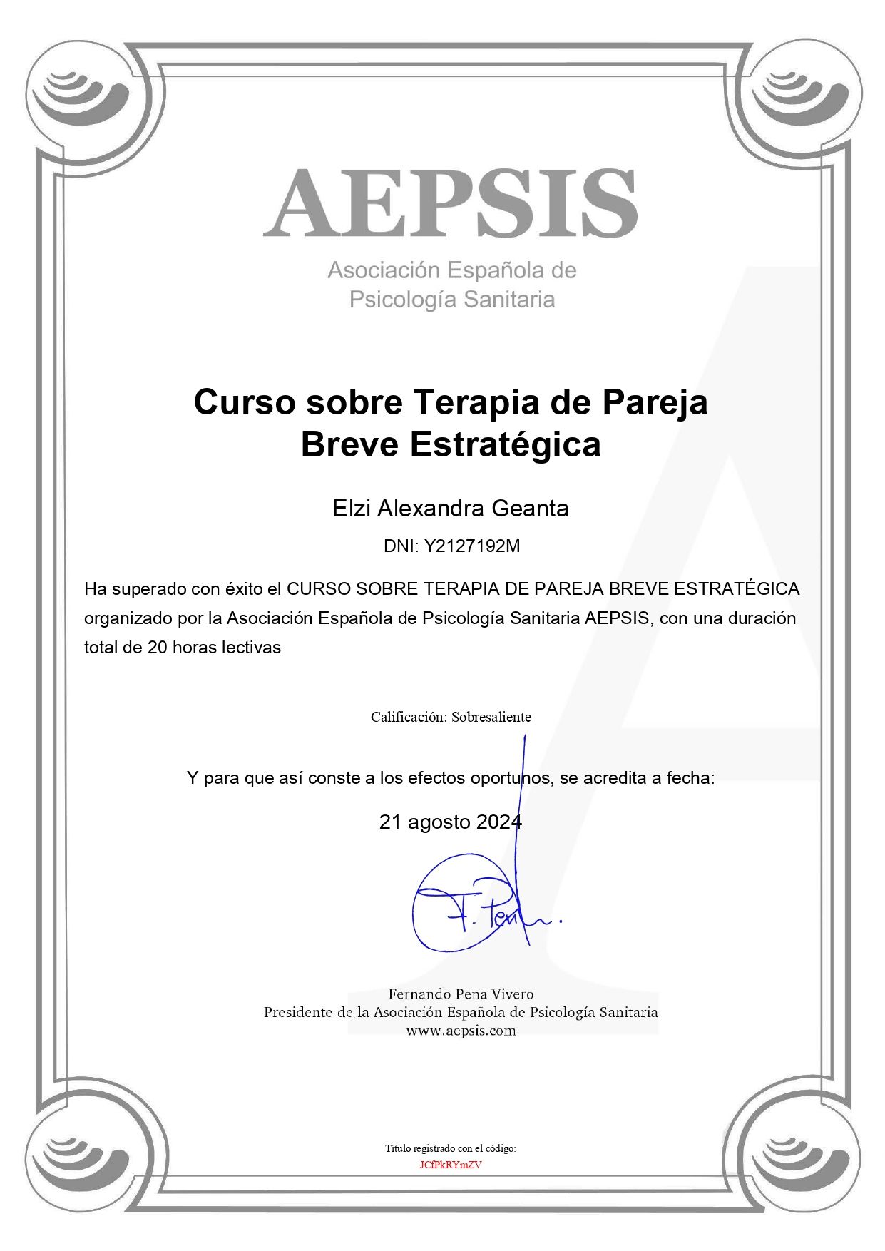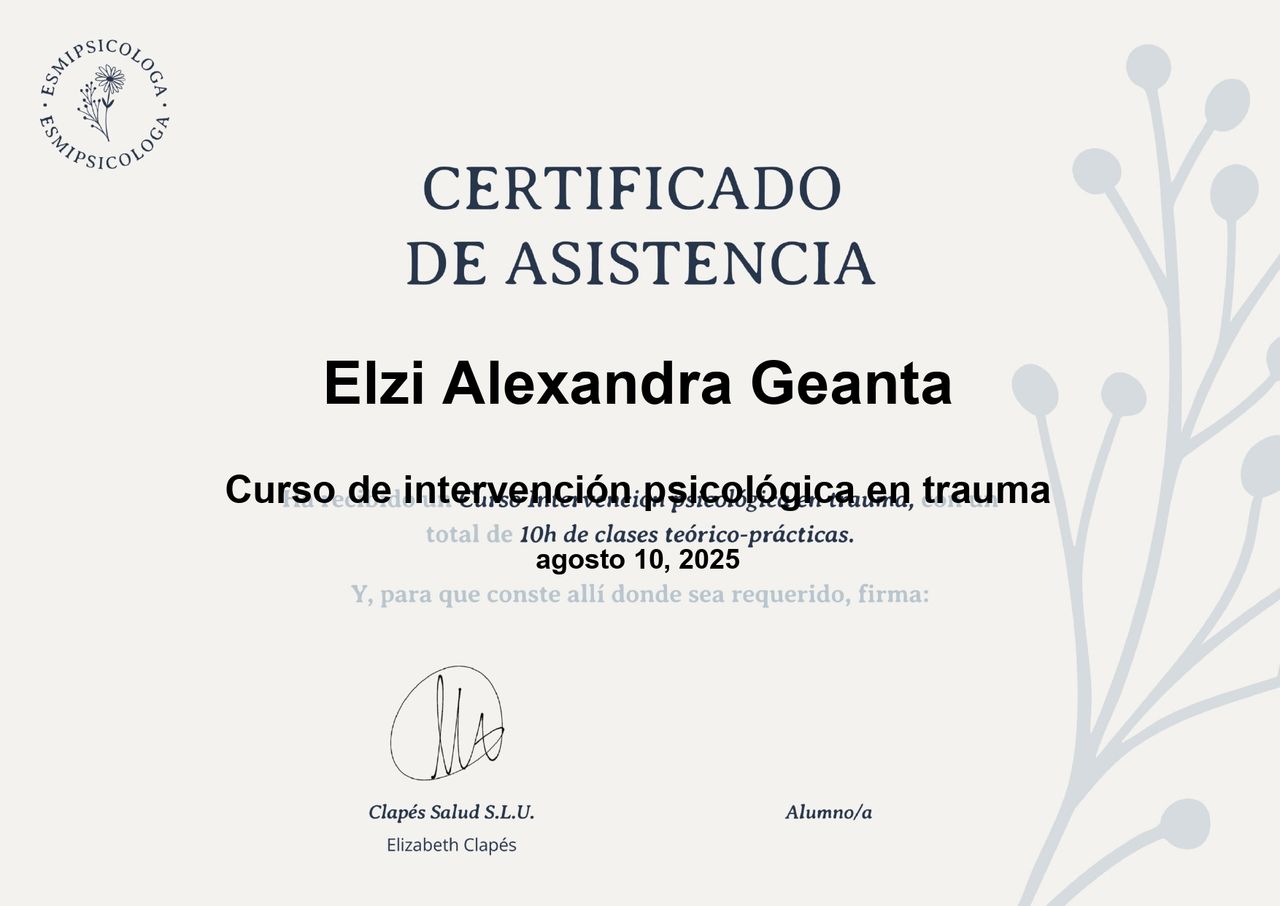¿Cuáles son las principales especialidades de Elzi Alexandra Geanta?Elzi Alexandra Geanta es psicóloga. Te mostramos algunos de los servicios que ofrece gracias a su trayectoria y amplia experiencia: Primera visita Psicología, Visitas sucesivas Psicología, Terapia cognitivo-conductual, Visita Psicología, Terapia de pareja, Relajación, Primera visita Psicología Infantil, Psicoterapia individual, Psicoterapia en adolescentes, Técnicas y estrategias de autoestima.