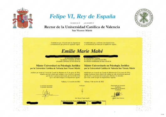 Psychologue inscrite à l’Ordre Officiel de Psychologie de la Communauté Valencienne (n°V17052), diplômée de l'Université Internationale de Valence avec une spécialité en Psychologie Juridique (Master à l'Université Catholique de Valence), inscrite sur la Liste Officielle des Psychologues Judiciaire [LOPF], bilingue (Espagnol, Français).