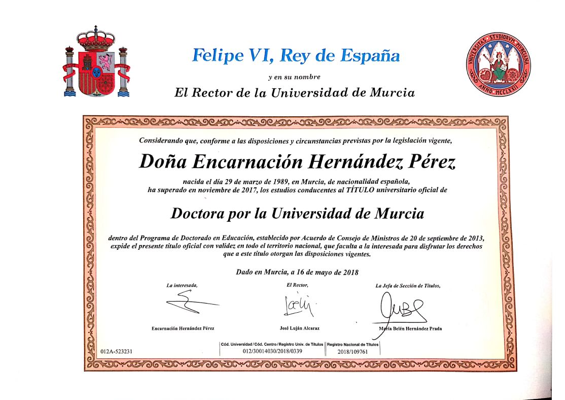 Doctora en Educación por la Escuela Internacional de Doctorado (Universidad de Murcia). Como parte de su formación predoctoral realiza el Master en Investigación e Innovación en Educación Infantil y Educación Primaria (Universidad de Murcia) el Master en Atención Temprana: Prevención y Promoción del Desarrollo Infantil (Universidad de Murcia) y el Máster Internacional en Neuropsicología (IAEU. Universidad Europea Miguel de Cervantes). Durante su formación predoctoral ha contado con diversas becas y contratos predoctorales: Beca FPU (Resolución del Rector R.- 100/2014 de la Universidad de Murcia de fecha 13 de febrero de 2014 (B.O.R.M. 18 de febrero); Ayuda de iniciación a la investigación 2013 (Resolución 559/2013 de 23 de julio de Rector de la Universidad de Murcia) y Beca de Colaboración (BOE 6-7-2011; Orden EDU/1868/2011 de 29 de junio). Durante su formación inicial, obtuvo el Premio Extraordinario Fin de Carrera en Psicopedagogía (2013) y el Premio Extraordinario Fin de Carrera en Magisterio en Educación Especial (2011). Consciente de que la promoción de un entorno inclusivo y equitativo de aprendizaje precisa de un trabajo interdisciplinar, ha desarrollado un trabajo colaborativo con diversas instituciones educativas y sanitarias. Desde el Grupo de Innovación docente INNOVA-Q de la Universidad de Murcia, en estrecha colaboración con la Consejería de Educación y Cultura de la Comunidad Autónoma de la Región de Murcia y, especialmente, con la Dirección General de Innovación Educativa y Atención a la Diversidad, ha desarrollado un trabajo de investigación en torno a los trastornos del neurodesarrollo que generan dificultades específicas de aprendizaje. En 2016 tuvo lugar la firma de un Convenio de Colaboración entre la Comunidad Autónoma de la Región de Murcia a través de la Consejería de Educación y Universidades y la Universidad de Murcia para colaborar en la Identificación Temprana del Alumnado con Dificultades Específicas de Aprendizaje. Fruto del trabajo coordinado entre el Grupo de Innovación Docente (GID) de la Universidad de Murcia y la Consejería de Educación y Cultura, surge PREDISCAL, una Prueba de cribado para la detección de dificultades lectoras o procesos matemáticos (Pina Paredes, V.; Rabadán Rubio, J. A.; Fenollar Cortés, J.; Hernández Pallarés, L. y Hernández-Pérez, E.) La citada herramienta ha sido galardonada con el XXII Premio TEA “Nicolás Seisdedos”, entregado en la IV Jornada de “Excelencia e Innovación en Psicología” (2017).