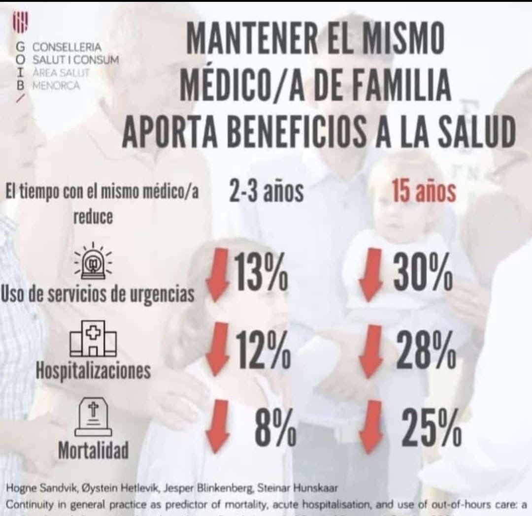 La evidencia científica demuestra que mantener el mismo médico de familia durante al menos 15 años reduce hasta un 30 % las visitas a urgencias, un 28 % las hospitalizaciones y un 25 % la mortalidad. Tener un médico que te conoce, te ordena las pruebas, coordina a los especialistas y te aconseja con criterio marca la diferencia.