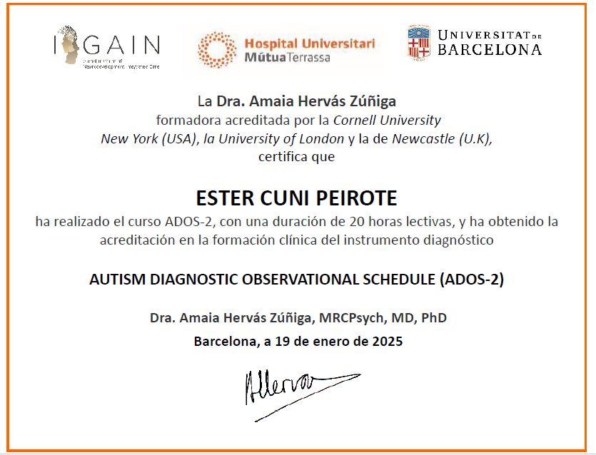 ¿Cuáles son las principales especialidades de Ester Cuni?Ester Cuni es psicóloga. Te mostramos algunos de los servicios que ofrece gracias a su trayectoria y amplia experiencia: Consulta online, Tratamiento del TDAH (Trastorno por Déficit de Atención y/o hiperactividad), Tratamiento para Trastorno del Espectro del Autismo (TEA), Tratamiento de las altas capacidades, Evaluación para el diagnóstico de autismo (ADOS 2 y ADI-R), Evaluación y Diagnóstico del TDAH (Trastorno por Déficit de Atención y/o hiperactividad), Diagnóstico de Trastornos del espectro autista (TEA), Evaluación para dislexia, Intervención TEA/habilidades sociales, Sesiones Individual Adulto.
