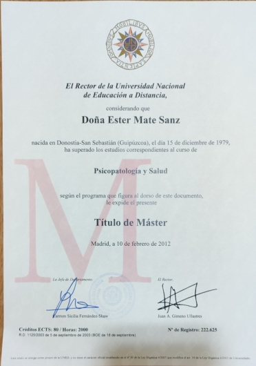 ¿Cuáles son las principales especialidades de Esther Mate Sanz?Esther Mate Sanz es psicólogo. Te mostramos algunos de los servicios que ofrece gracias a su trayectoria y amplia experiencia: Primera visita Psicología, Relajación, Reestructuración cognitiva, Psicoterapia individual, Consulta de Psicología Sanitaria, Psicoterapia, Técnicas y estrategias de autoestima, Terapia de duelo, Terapia individual, Visita Psicología.