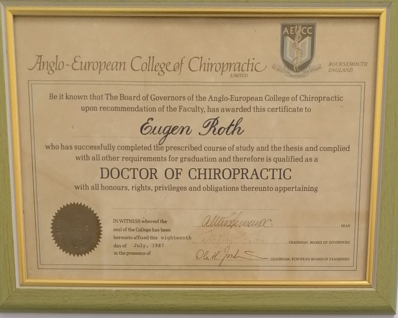 Nacido en Sudafrica Eugen Roth D.C. graduo en 1987 de Anglo-European College of Chiropractic (Reino Unido)