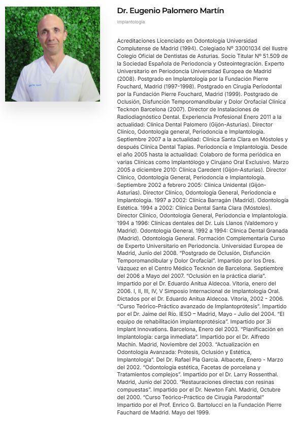 ¿Cuáles son las principales especialidades de Eugenio Palomero Martin?Eugenio Palomero Martin es dentista. Te mostramos algunos de los servicios que ofrece gracias a su trayectoria y amplia experiencia: Primera visita Odontología, Visita de revisión, Implantología de carga inmediata con cirugía poco invasiva, Extracción dental, Implantes dentales, Extracción de cordal incluido, Carillas de porcelana, Cirugía del frenillo labial, Cirugía mucogingival, Cirugía periodontal.
