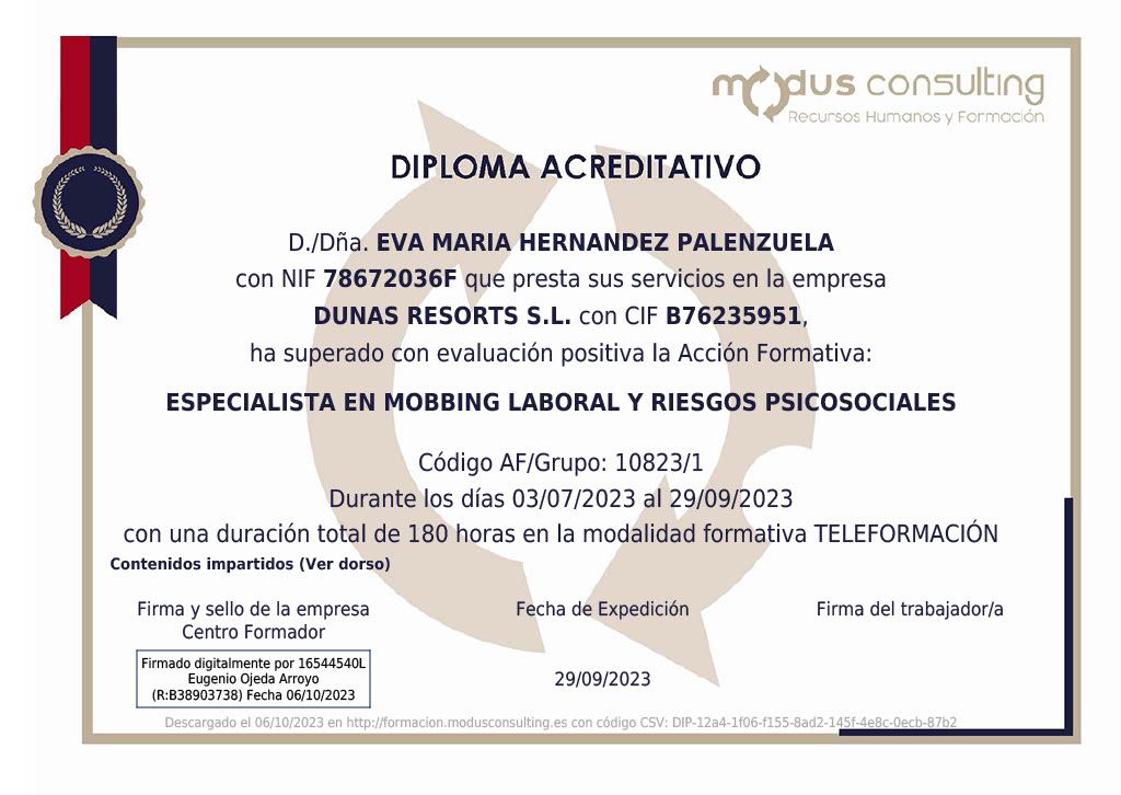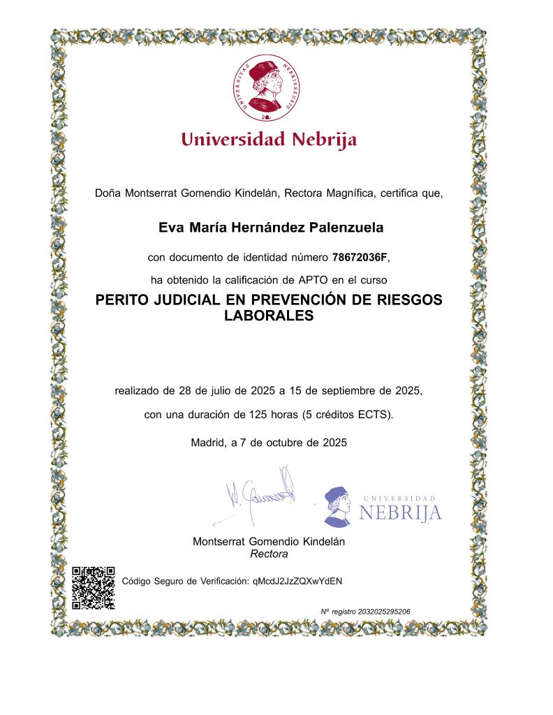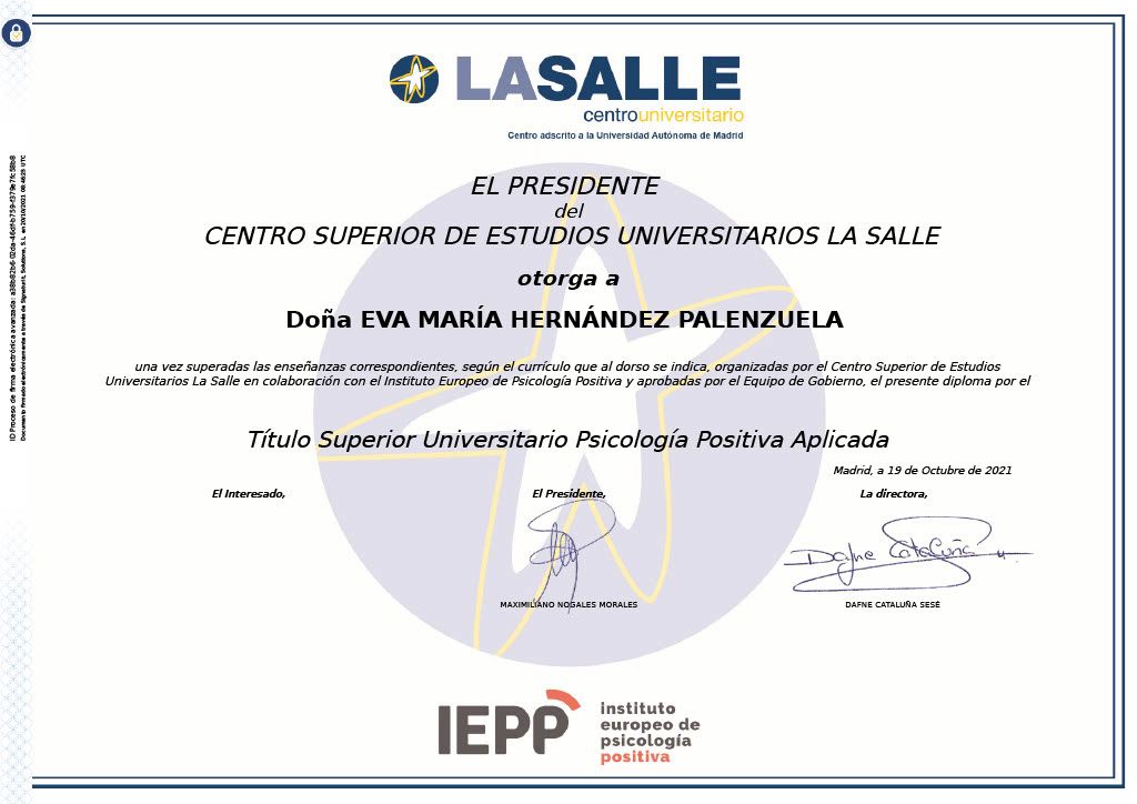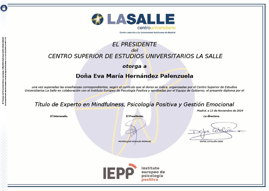 Estoy licenciada en Psicología, con un máster en prevención de riesgos laborales (PRL) y otro en Coaching Profesional por la Universidad Autónoma de Madrid. Además, cuento con certificaciones en entrenamiento en Mindfulness y en gestión emocional otorgadas por el Instituto Europeo de Psicología Positiva (IEPP).