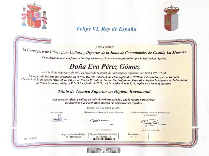 ¿Cuáles son las principales especialidades de Eva Pérez Gómez?Eva Pérez Gómez es higienista dental. Te mostramos algunos de los servicios que ofrece gracias a su trayectoria y amplia experiencia: Limpieza dental, TAC de cráneo (Cone Beam), Radiografía de teleradiografía, Radiografía de muñeca, Escaner intraoral prótesis 3d, Odontología Infantil / Odontopediatría, Estética dental, Blanqueamiento dental, Tratamiento con fluor, Odontología preventiva niños.