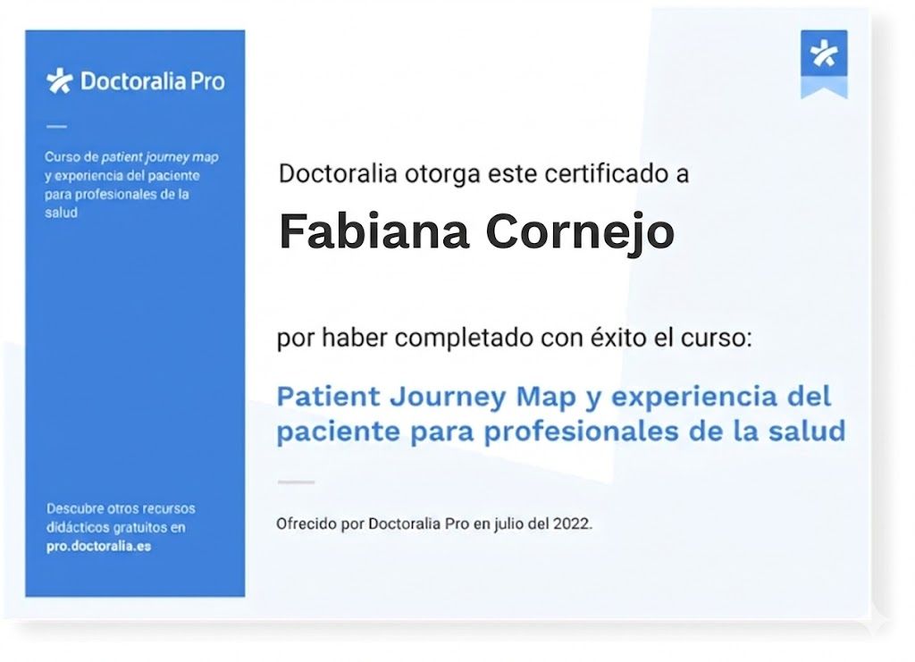 ¿Cómo puedo reservar una cita con Fabiana Cornejo?El calendario que muestra Fabiana Cornejo en Doctoralia está actualizado en tiempo real, por lo que solo tienes que elegir qué día y hora te va mejor de entre las disponibles. La reserva es gratuita, y además recibes un recordatorio antes de la visita.
