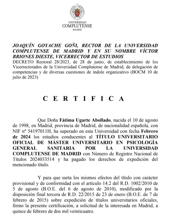 Hola, soy Fátima Ugarte, Psicóloga General Sanitaria con especialización en terapia para adultos, familias y población infantojuvenil. Acompaño a personas que desean comprenderse mejor, superar dificultades emocionales y construir relaciones más sanas y auténticas.