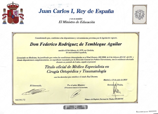 Dr. Federico Rodríguez De Tembleque Aguilar Licenciado en Medicina y Cirugía por la Universidad de Navarra en el año 2003. Formación especializada en Cirugía Ortopédica y Traumatología en el Hospital Universitario Reina Sofía de Córdoba durante los años 2004-2009. En la actualidad realiza su actividad profesional en los siguientes centros: