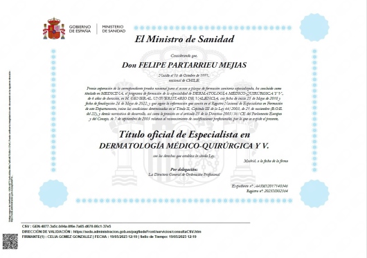 ¿Cuáles son las principales especialidades de Felipe Partarrieu Mejías?Felipe Partarrieu Mejías es dermatólogo. Te mostramos algunos de los servicios que ofrece gracias a su trayectoria y amplia experiencia: Visita Dermatología, Rutina dermocosmética, Tratamiento de acné, Tratamiento para hiperhidrosis, Tratamiento para la alopecia, Tratamiento de la rosácea, Cuidados acné, hiperpigmentación, melasma, Tratamiento de la psoriasis, Tratamiento para dermatitis atópica, Primera visita Dermatología.