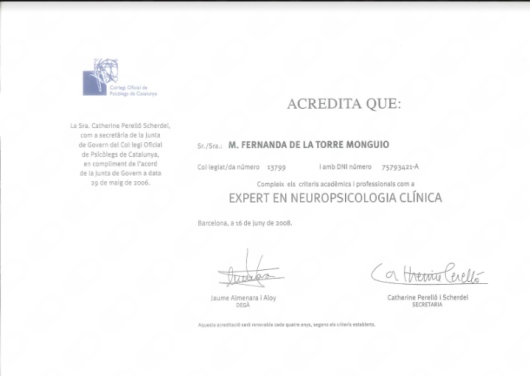 ¿Cuáles son las principales especialidades de Fernanda de la Torre Monguió?Fernanda de la Torre Monguió es psicóloga. Te mostramos algunos de los servicios que ofrece gracias a su trayectoria y amplia experiencia: Primera visita Psicología, Visita sucesiva psicología, Evaluación neuropsicológica.