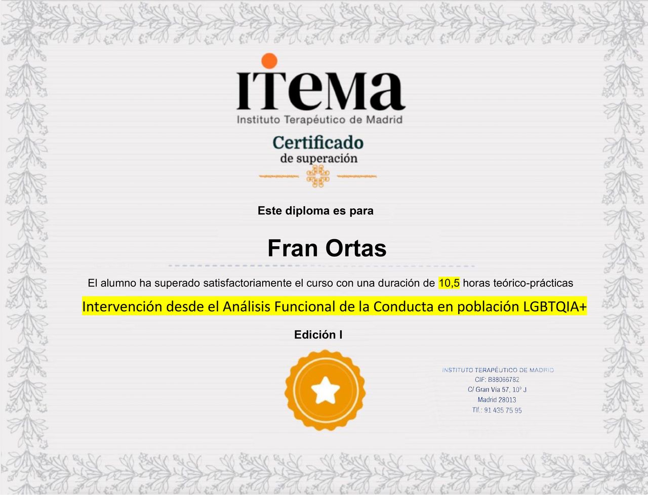 ¿Cuáles son las principales especialidades de Fran Ortas Barajas?Fran Ortas Barajas es psicólogo. Te mostramos algunos de los servicios que ofrece gracias a su trayectoria y amplia experiencia: Consulta online, Primera visita online, Consulta de pareja online, Psicoterapia (LGTBIQ+), Terapia de pareja (LGTBQ), Terapia sexual, Terapia sexual para LGTBIQ+, Terapia sexual y/o de pareja (Sexología), Acompañamiento en aceptación (LGTBQ), Gestión de relaciones sexuales (LGTBQ).