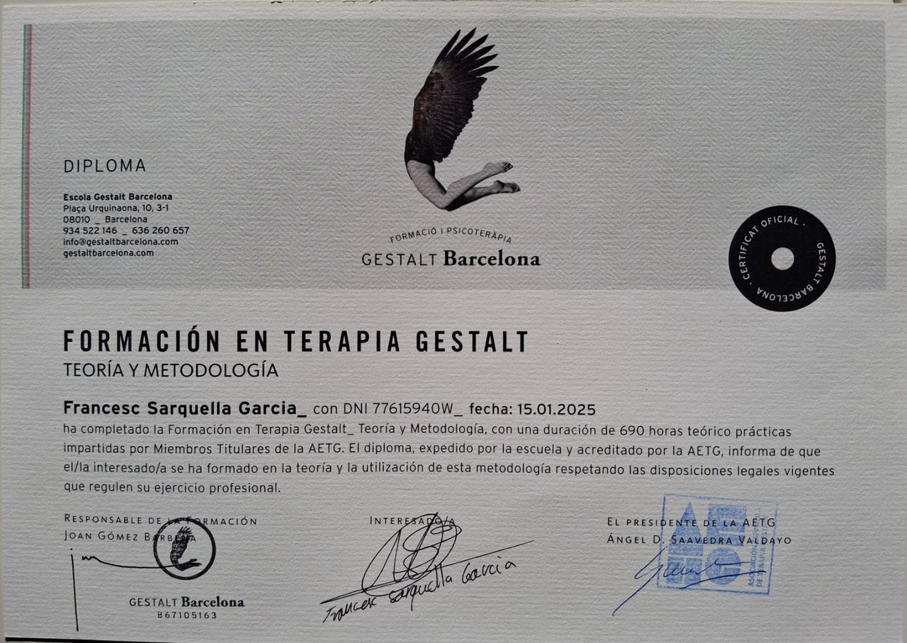 Estoy realmente encantada con Francesc. Es cercano, transmite mucha confianza y tiene un don para ayudarte a abrirte con naturalidad. Te hace sentir muy cómoda en cada sesión. Tanto mi hija, que fue quien empezó con él, como yo estamos muy agradecidas por el acompañamiento recibido. Sin duda, lo recomiendo al 100%.