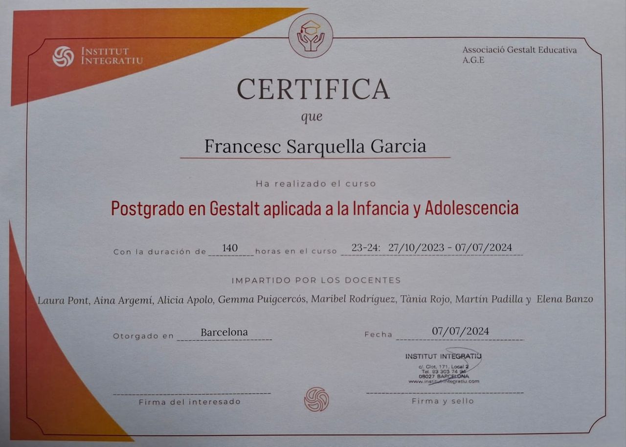 ¿Cuáles son las principales especialidades de Francesc Sarquella Garcia?Francesc Sarquella Garcia es terapeuta complementario. Te mostramos algunos de los servicios que ofrece gracias a su trayectoria y amplia experiencia: Terapia Gestalt adolescencia, Primera visita psicologia adolescentes, Primera visita Psicología Infantil, Visita Psicología Infantil, Terapia con adolescentes, Terapia Gestalt infantil, Primera visita terapia de pareja, Terapia de pareja, Terapia Gestalt, Psicoterapia Gestalt.