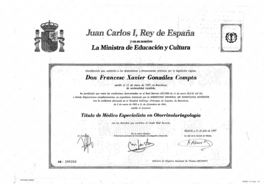 • Especialista en Otorrinolaringología y Cirugía de cabeza y cuello, via MIR en el Hospital Universitari de Bellvitge - 1996