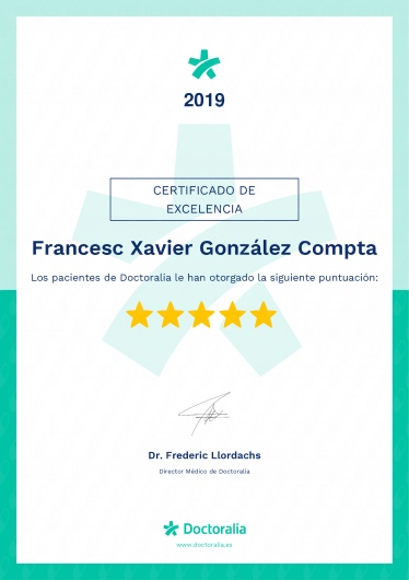 ¿Qué opinan los pacientes de Francesc Xavier González Compta?Un total de 534 pacientes han querido dejar una opinión sincera y real sobre Francesc Xavier González Compta, otorgándole además una valoración media de 5 estrellas (sobre un máximo de 5).