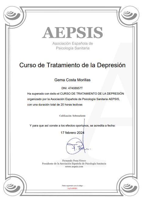 ¿Cuáles son las principales especialidades de Gema Costa Morillas?Gema Costa Morillas es psicóloga. Te mostramos algunos de los servicios que ofrece gracias a su trayectoria y amplia experiencia: Preparación emocional al parto, Psicología Perinatal, Visita seguimiento psicología, Primera visita Psicología, Diagnóstico y tratamiento para trastornos de ansiedad, Gestión de ansiedad ante los exámenes, Gestión de la ansiedad, Gestión de la ansiedad y el estrés ante el COVID-19, Terapia para ansiedad, Tratamiento de ansiedad por enfermedad.